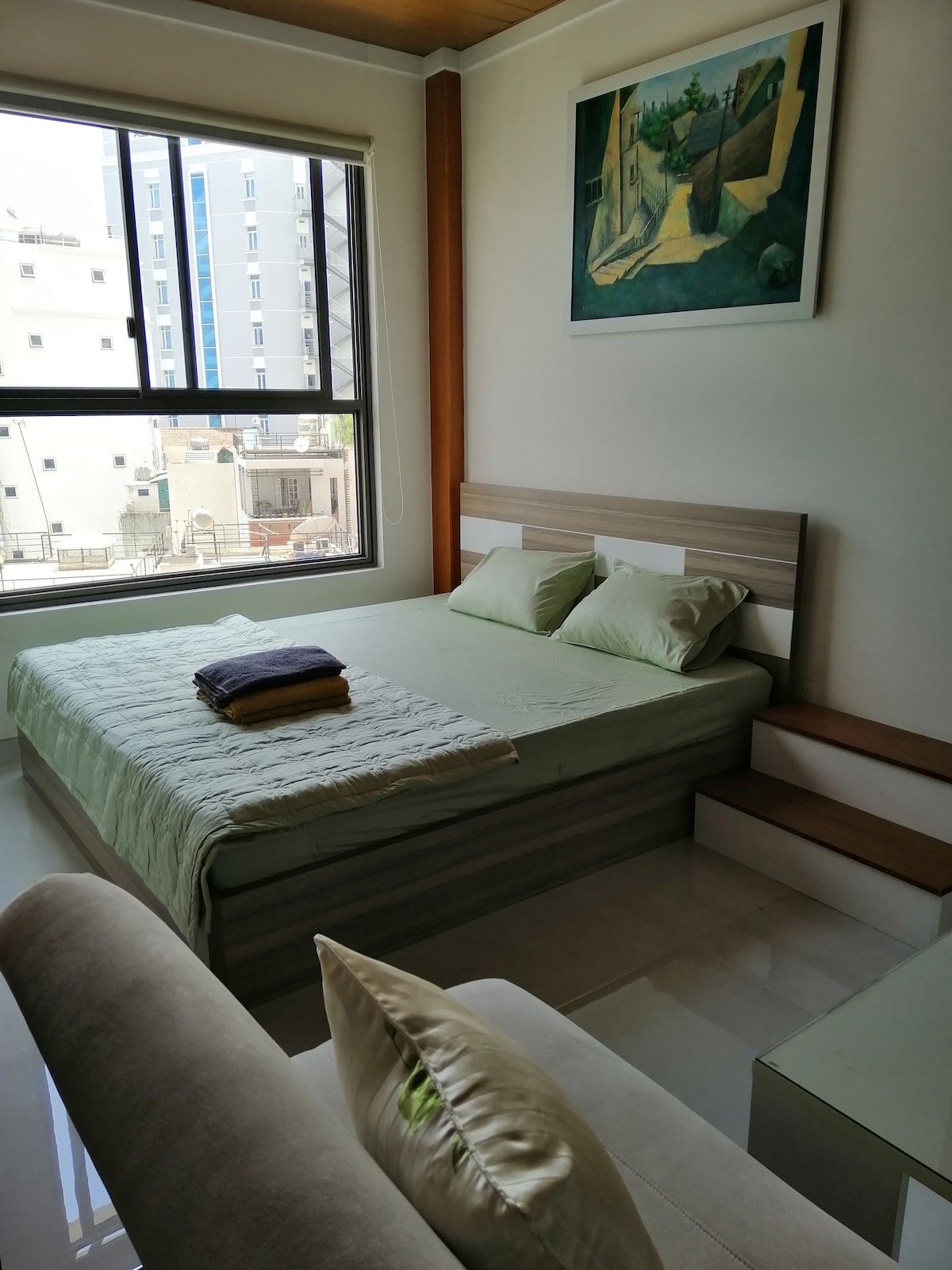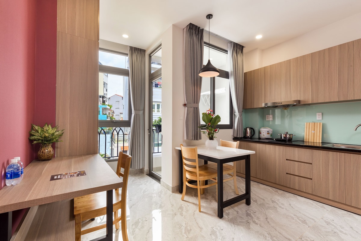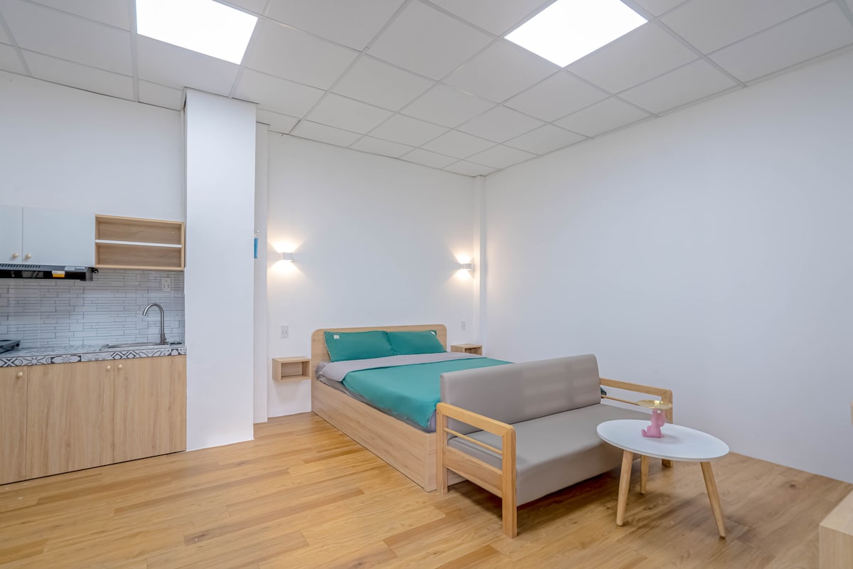 Studio entièrement équipé avec balcon 1 lit Queen Size avec matelas Dunlopillo confortable Cuisine privée, salle de bain, réfrigérateur, télévision Jardin extérieur au dernier étage Hôte parlant anglais et vietnamien, Internet 120 Mbps. Emplacement pratique : à 10 mètres de la route principale ; À 15 mn en taxi de l'aéroport, de la gare, de Notre-Dame. À 20 mn du marché de Ben Thanh, centre-ville. À 5 mn des centres de congrès tels que White Palace, Adora, Quan Khu 7. À distance de marche des marchés, boutiques, restaurants...