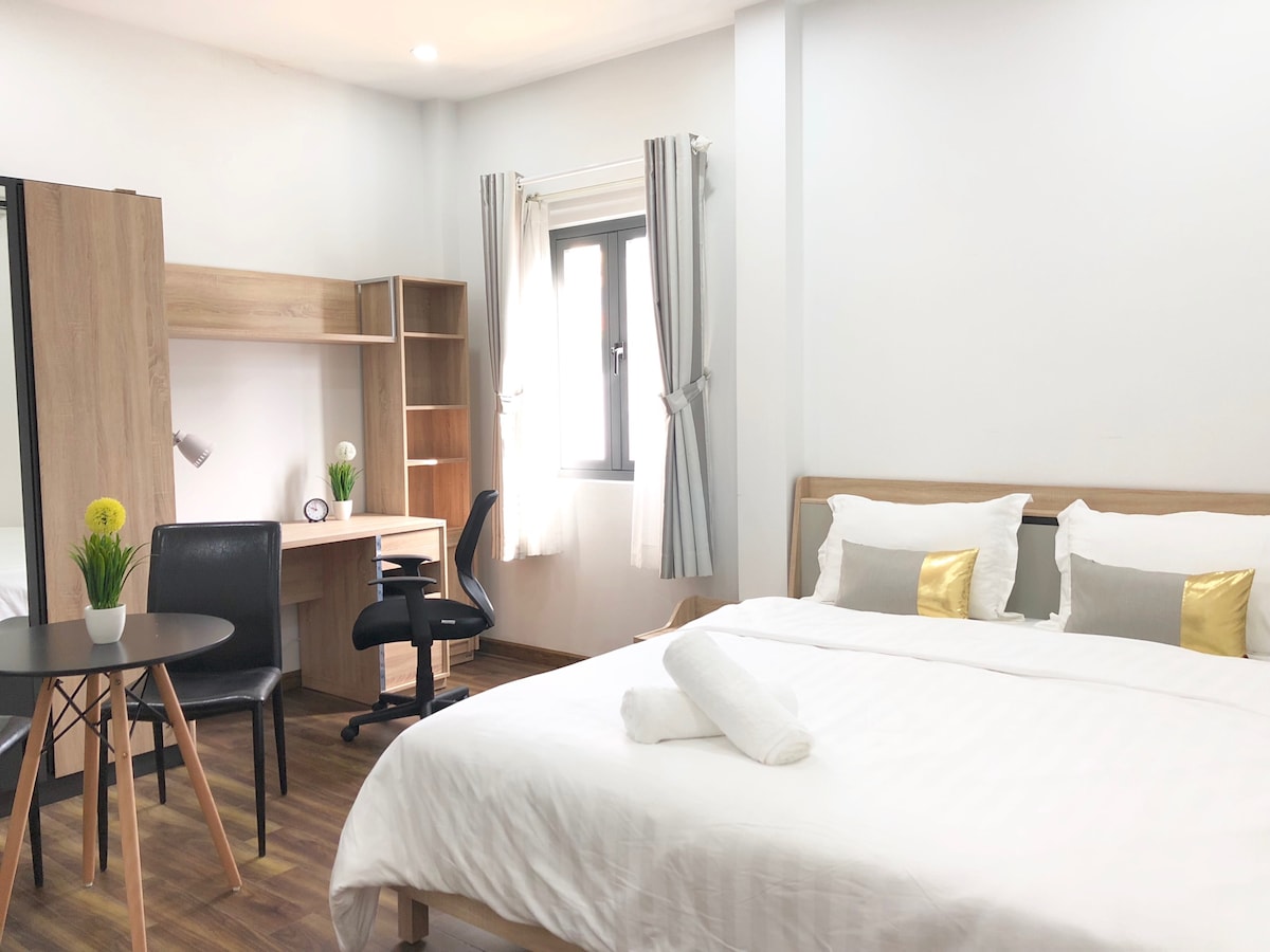 Studio entièrement équipé avec balcon 1 lit Queen Size avec matelas Dunlopillo confortable Cuisine privée, salle de bain, réfrigérateur, télévision Jardin extérieur au dernier étage Hôte parlant anglais et vietnamien, Internet 120 Mbps. Emplacement pratique : à 10 mètres de la route principale ; À 15 mn en taxi de l'aéroport, de la gare, de Notre-Dame. À 20 mn du marché de Ben Thanh, centre-ville. À 5 mn des centres de congrès tels que White Palace, Adora, Quan Khu 7. À distance de marche des marchés, boutiques, restaurants...