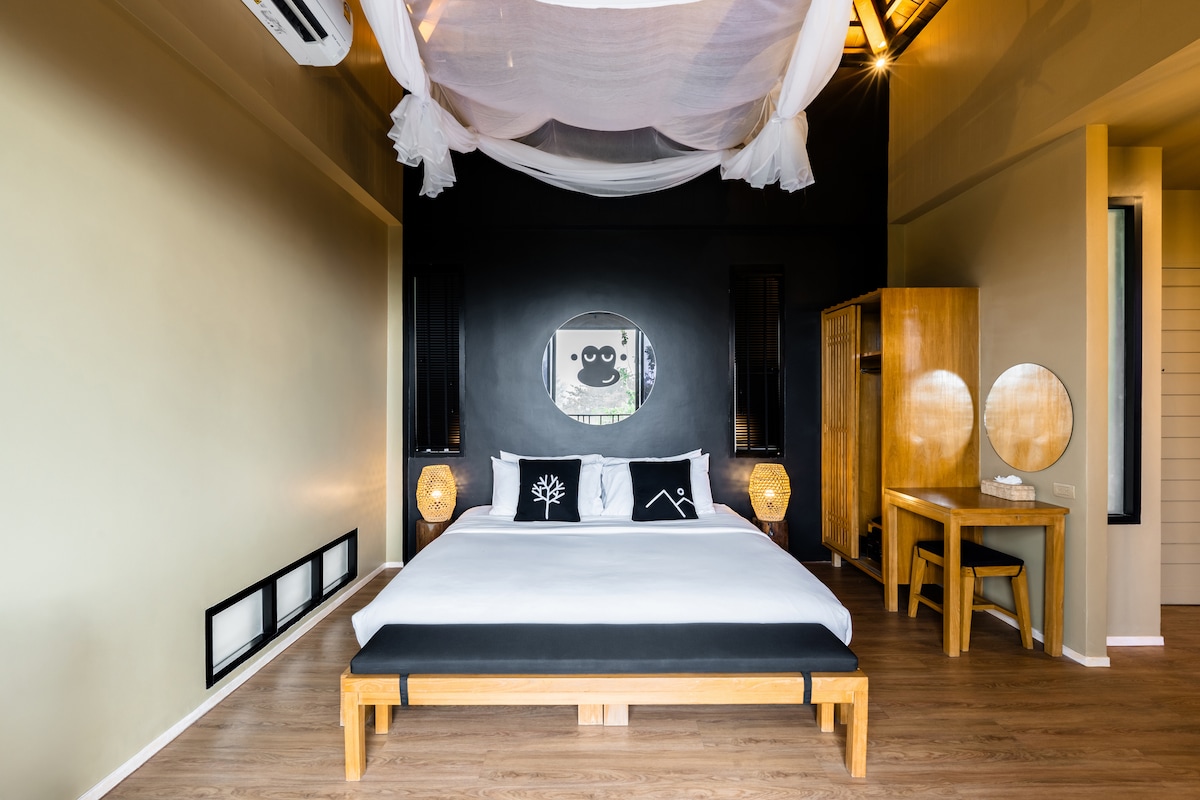 Ma villa a une superficie de 60 m ². Nous avons également CONDUIT TV , télévision par câble, air conditionné , bureau de table à thé, cuisine que vous pouvez faire de la nourriture, goutte-à-goutte de café, lampadaire artiste spécial du nord de la Thaïlande, avant que vous n'arriviez, nous avons un système de cartes clés sur notre porte. Je fais en sorte que ma villa ait une impression de style japonais dans la chambre et dans la salle de bain.