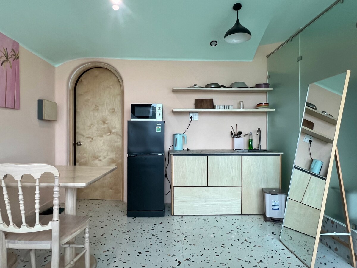 La chambre 101 est un studio confortable situé dans un excellent emplacement, à 3 minutes de l'aéroport et à 10 minutes du centre. - La chambre est conçue dans un style japandi avec une lumière naturelle complète, des meubles en bois et entièrement équipée d'ustensiles de cuisine pour apporter une sensation chaleureuse comme à la maison - Situé au rez-de-chaussée avec sa propre porte, très privé et facile à amener des bagages. - La chambre est équipée d'un projecteur moderne installé avec Netflix pour vous permettre de regarder facilement de bons films comme un mini home cinéma.