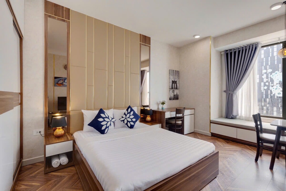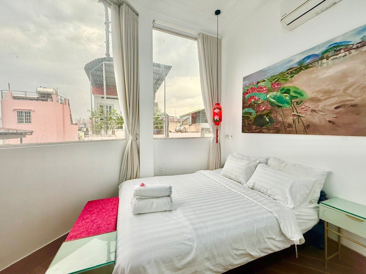 Notre studio est niché au 10e étage d'un immeuble ancien dans le cœur animé de Saigon. Grâce à son emplacement central, vous serez à quelques pas du marché de Ben Thanh et de l'emblématique tour Bitexco, avec les sons animés de la ville qui s'ajoutent à l'expérience locale authentique (POSSIBILITÉ DE BRUIT À PROXIMITÉ). À l'intérieur, détendez-vous dans un studio soigneusement décoré, confortable et spacieux, conçu pour le confort et la détente. Votre retraite parfaite après une journée à explorer la meilleure cuisine de rue, les magasins et les attractions de Saigon.
