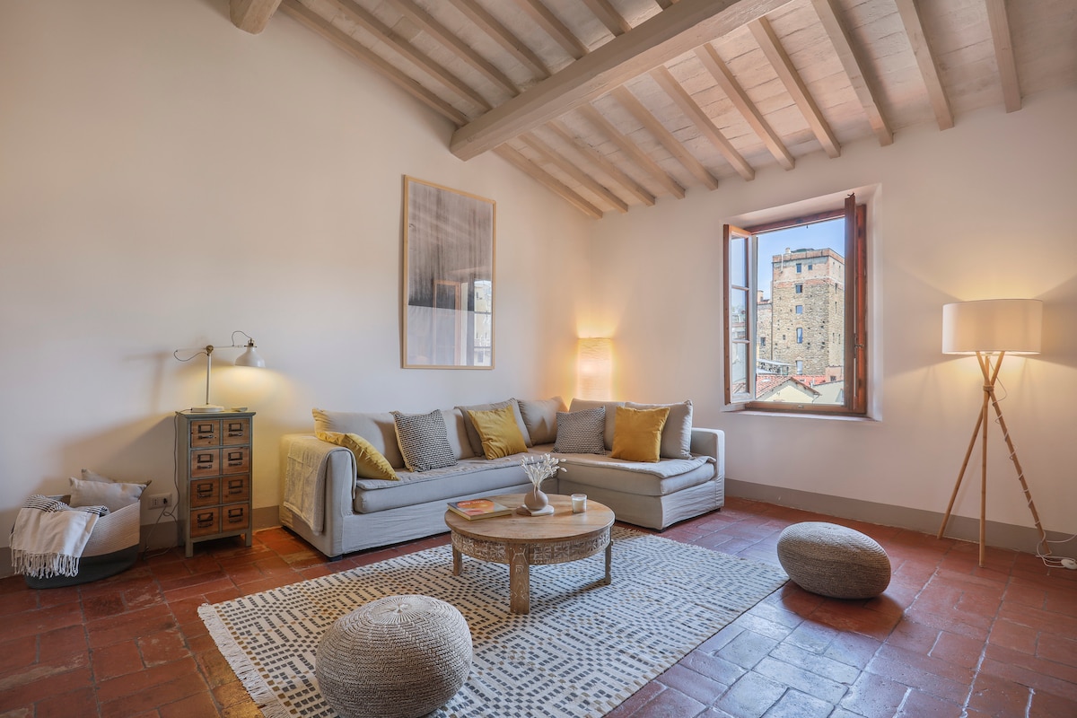 Luminoso e silenzioso loft all'ultimo piano nel quartiere Oltrarno del centro storico. Vicino a tutti i monumenti e trasporti pubblici. Offre tutti i comfort per un soggiorno rilassante. Splendida vista su Palazzo Pitti e sui giardini di Boboli. Nessun ascensore. Per 1-2 persone.
