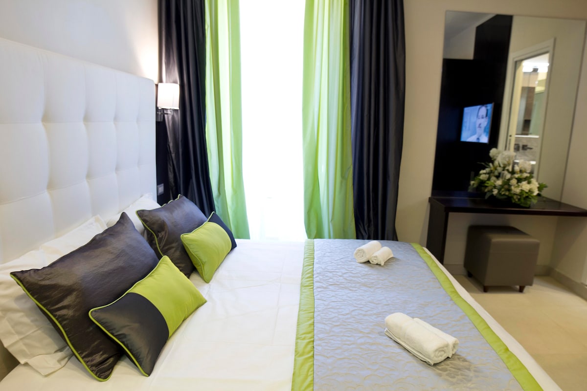 Chambre double dans une élégante boutique quelques chambres dans le centre historique de Rome, entre le Colisée et Termini près de la fontaine de Trevi et Spanish Steps. Les vacances romaines sont situées dans le quartier de Monti, dans l'immeuble de 1884, à quelques minutes de la gare Termini et des principales attractions touristiques, facilement accessibles à pied. Un espace privé avec quelques chambres à la décoration élégante et moderne