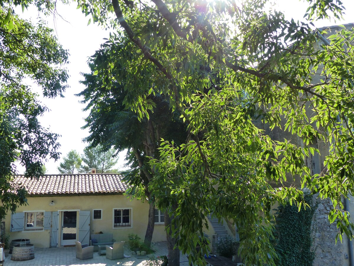 ECRIN DE VERDURE Logt de 60 M2 ( salon , cuisine , 2 ch, 1 SDB + 1 WC ind.)situé au Rez de chaussée d'une maison avec terrasse privative. le terrain de 28OO M2 et la piscine sont en commun avec les propriétaires. Situé à 2 pas de Montpellier ( 15 minutes) et de la Mer dans un village médiéval. Toutes commodités pour commerces et transport en commun. Prêt de vélo gratuit. Randonnées sur place. Accés aux équipements fitness + trampoline + table sous les pins......Log idéal pour famille.