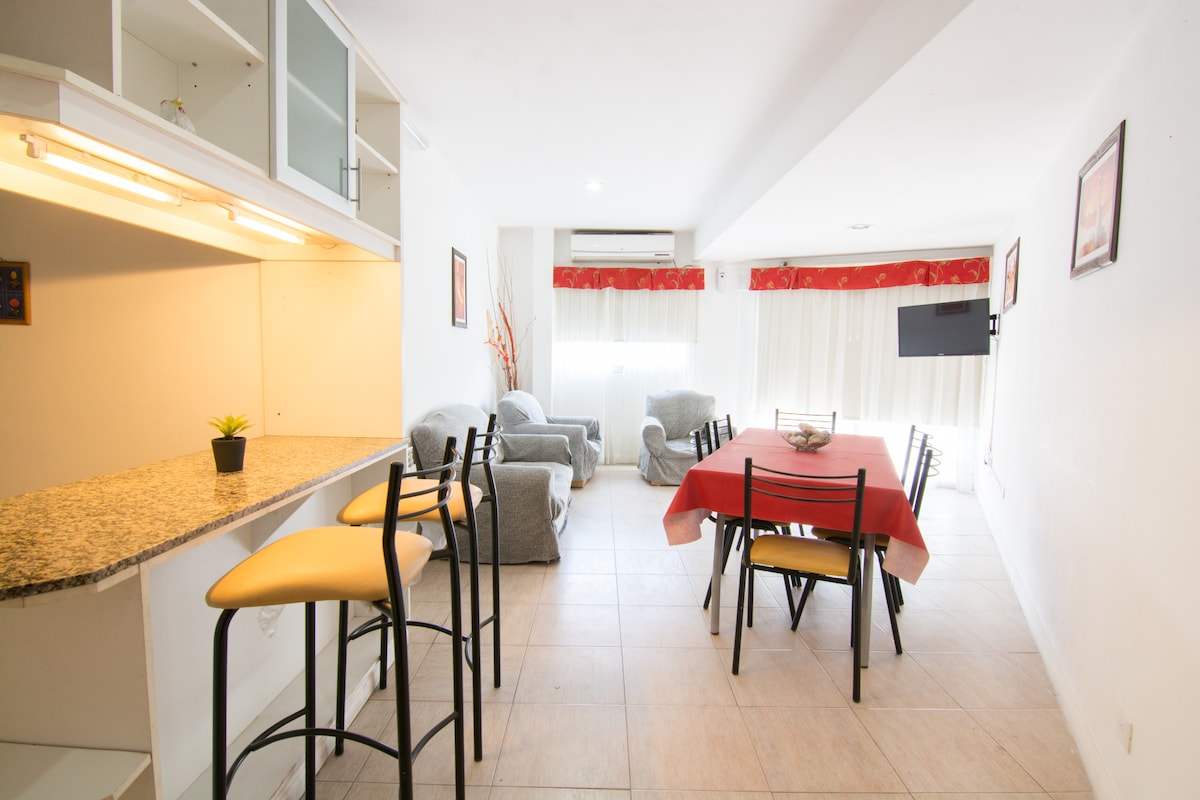 Appartement Monoenvironnement meublé et équipé de vaisselle et d'ustensiles, réfrigérateur avec congélateur, kitchinette et climatiseur individuel. Pour 2 personnes ( avec moins de 3 ans partageant un lit avec des adultes)
