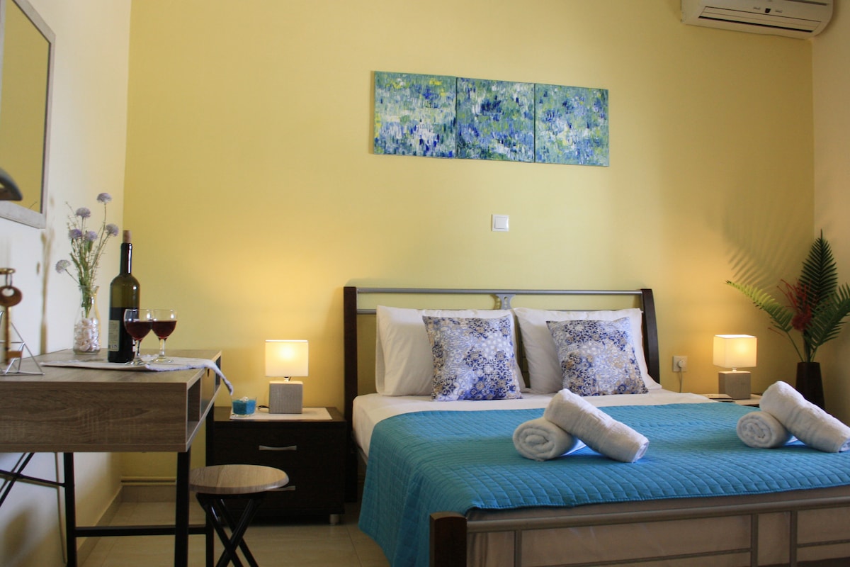 Situé à 5 minutes à pied de la plage et à 10 minutes du centre. Le studio est calme, neuf, familial composé de lits jumeaux, climatisation, cuisine entièrement équipée, salle de bains spacieuse et balcon privé. L'hébergement est situé dans un jardin méditerranéen avec des oliviers, des vignes, de l'herbe et beaucoup de belles fleurs. Plus important encore, vous pouvez être sûr d'une véritable chaleur et une atmosphère conviviale fournies par nous-mêmes et notre famille tout au long de votre séjour. Pefkos est une petite ville située au sud de l'île grecque de Rhodes, à 56 kilomètres de la capitale Rhodes. L'île de Rhodes est la plus grande des îles du Dodécanèse. La ville de Pefkos est construite dans un vieux village, autrefois connu sous le nom de ville de pêcheurs et situé entre les grandes villes de Lindos et Lardos. Visiter Pefkos de jour laissera l'impression d'une station de vacances endormie et détendue, mais quand les lumières s'allument sur la station est animé par une activité chaleureuse et conviviale. La plage de Pefkos a reçu le statut de pavillon bleu en 2006. La plage est occupée par les touristes pendant la journée et dispose d'équipements tels que des toilettes, plusieurs cafés et bars. Des pédalos, des hors-bord et des jet-skis sont également disponibles à la location sur la plage.