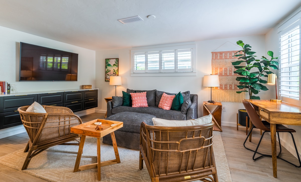 Découvrez l'élégance pure dans ce studio récemment rénové. Avec une entrée privée, il peut accueillir confortablement 3 personnes (2 au lit, 1 sur le canapé). Profitez d'un parking dédié, d'une salle de bain complète, d'un lit queen somptueux, d'un canapé confortable et d'une kitchenette bien équipée. Nichée dans un endroit tranquille près du centre-ville de Sarasota, cette oasis offre un accès facile aux délices urbains. La plage de Siesta se trouve à seulement 8,7 miles, tandis que Lido Beach vous invite à 5,8 miles. Votre escapade ultime commence ici !