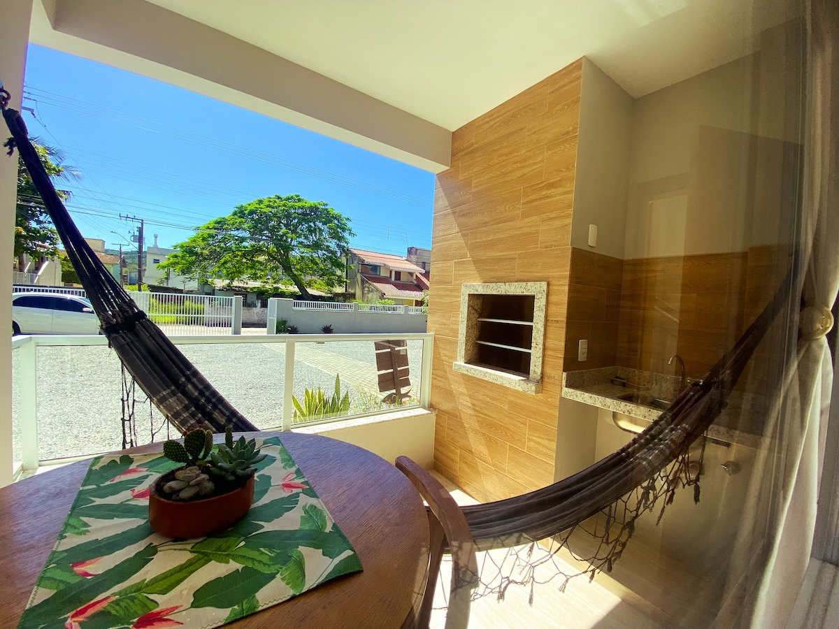L'appartement est situé dans une servitude tranquille à Praia da Pinheira à 700m de Praia de Baixo, à 2km de Praia de Cima et à 2,5km de Guarda do Embaú. Il peut accueillir jusqu'à 2 adultes et 1 enfant; dispose d'une cuisine complète avec cuisinière, four électrique, micro-ondes, grille-pain, réfrigérateur, cafetière et mixeur. Salon avec canapé-lit et TV. Une chambre avec un lit double, une armoire, un grand miroir et un ventilateur. Salle de bain avec baignoire à hydromassage et douche électrique. En plus d'un grand balcon.