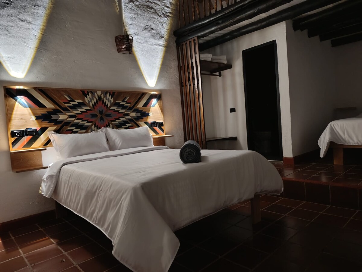 Chambre confortable avec salle de bain privée, eau chaude, équipée d'ustensiles et de lingerie hôtelière, environnement calme entouré d'une nature luxuriante. Conçue pour une expérience familiale spéciale, avec des tons boisés qui permettent de se connecter avec la culture ancestrale. Vous vous réveillerez avec le son de la nature environnante qui s'infiltre à travers les murs, créant un environnement calme et harmonieux pour les visiteurs. Sa décoration présente un pictogramme faisant allusion au feu.