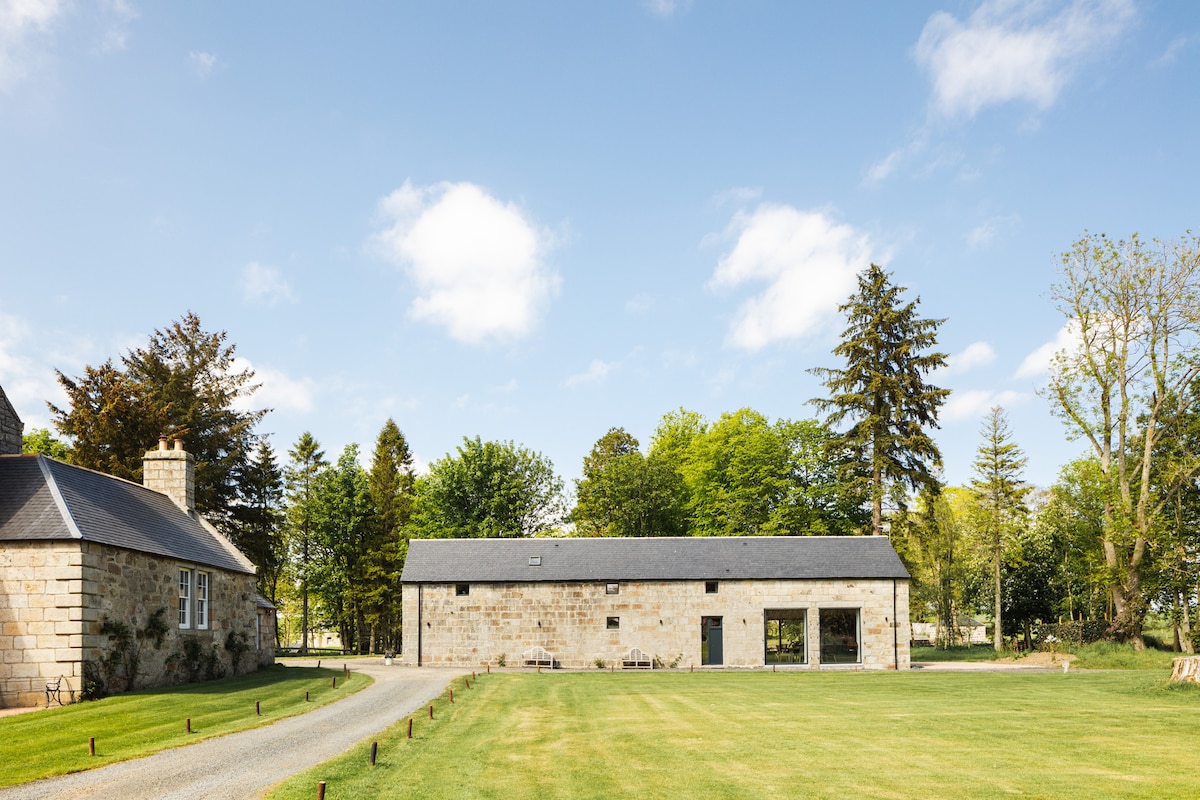 The Byre at Butterywells Farm is a converted byre located next to our farmhouse, which dates back over two hundred years. The Byre is a fully equipped self catering holiday cottage with many original features. The Byre is wheelchair accessible with its own parking area. Set in 2 acres of mature gardens containing walks, secluded seating areas and a small lochan. Experience country living whilst only being a 15 min drive from the centre of Aberdeen. Not just dogs are welcome but horses too.