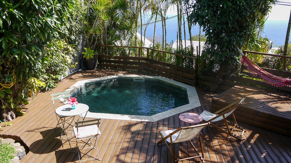 Dans villa 200 m d'altitude avec piscine chauffée : petit bungalow indépendant dans jardin (chambre parentale, lit double, salle d'eau, cuisine ext.). Accès partagé à une terrasse couverte avec une grande table, au jardin et à la piscine. Nous avons dans le jardin un chien charmant. Il y a un supplément de 6€ par nuit si vous êtes 2. Des commerces de proximité à moins de 10 min à pied. Saint-Paul centre à 20 min en voiture et plages à 30 min. Transports en commun possibles mais compliqués.