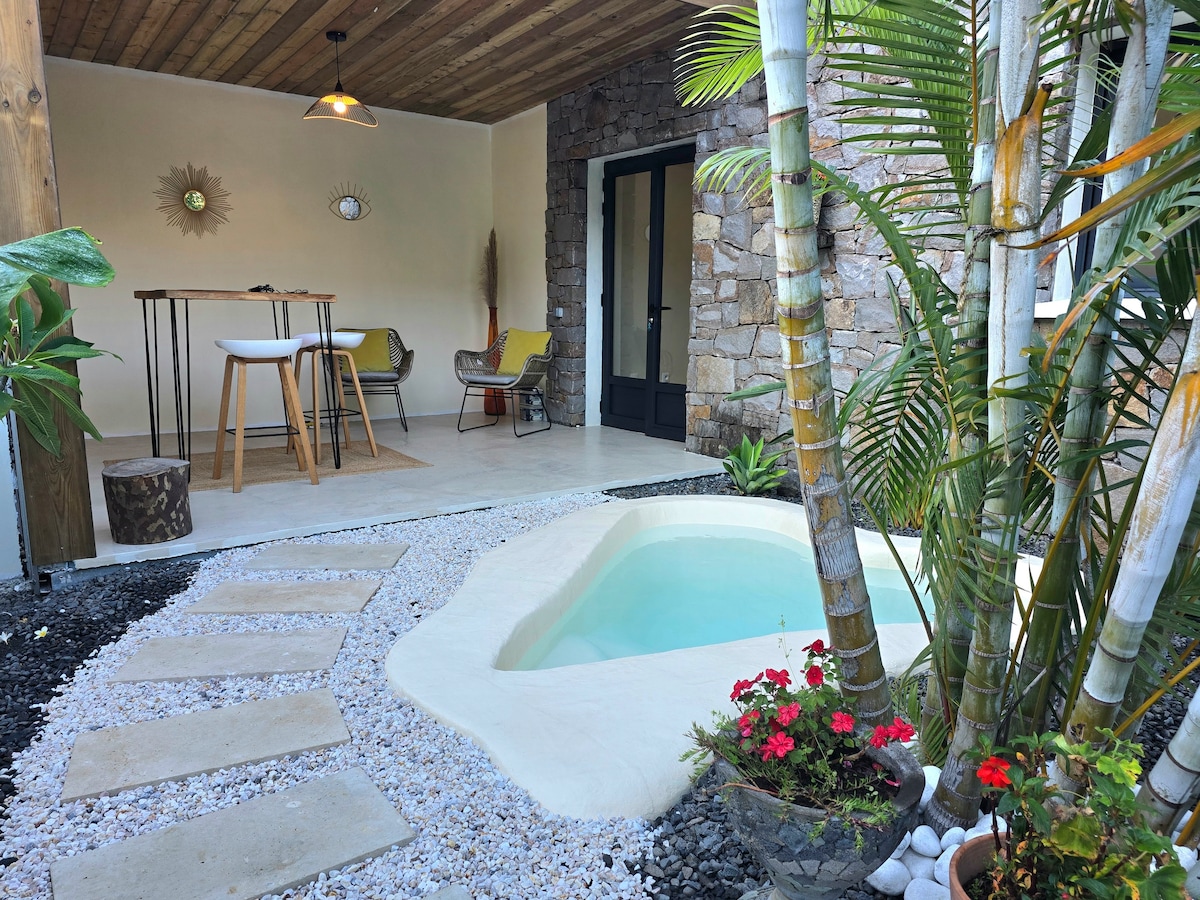 Dans villa 200 m d'altitude avec piscine chauffée : petit bungalow indépendant dans jardin (chambre parentale, lit double, salle d'eau, cuisine ext.). Accès partagé à une terrasse couverte avec une grande table, au jardin et à la piscine. Nous avons dans le jardin un chien charmant. Il y a un supplément de 6€ par nuit si vous êtes 2. Des commerces de proximité à moins de 10 min à pied. Saint-Paul centre à 20 min en voiture et plages à 30 min. Transports en commun possibles mais compliqués.