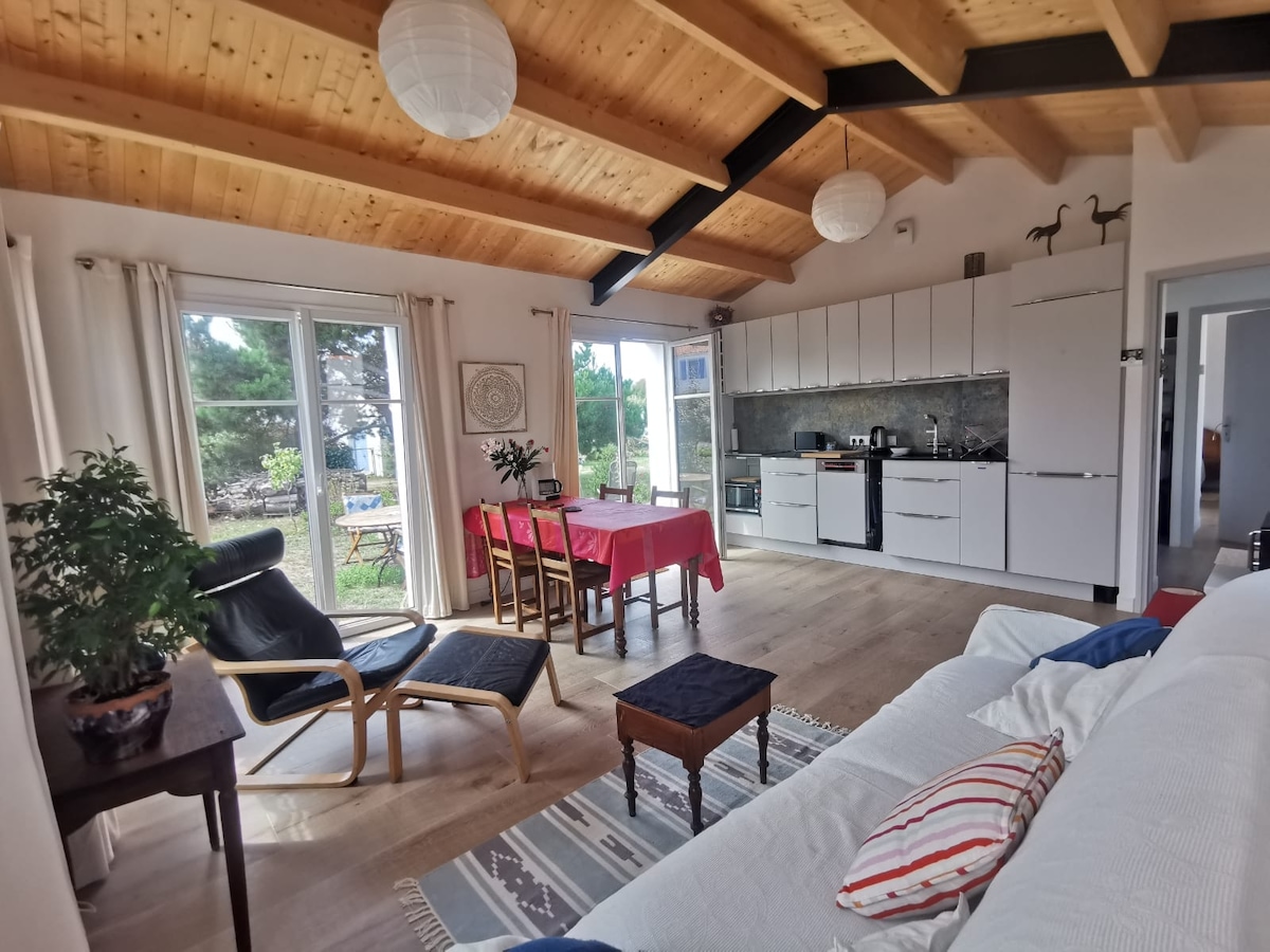 Maison individuelle 71m², terrasse petit jardin sud clos calme Proche du port, commerces 15mn à pied, 5mn à vélo Belle plage de Ker Châlon à 150m Idéale pour séjour avec enfants Belle pièce à vivre 34m², cuisine équipée ouverte sur salon Affaires bébé 1 chambre lit double, 1 chambre 2 lits simples, lits neufs Lave-vaisselle, four, micro-onde, induction Salle de douche, lave-linge, sèche-linge, WC séparé Barbecue Non fumeur, Pas d'animaux