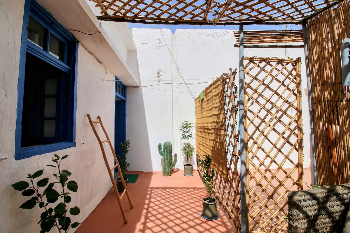 Riad marocain traditionnel avec cour ouverte dans la médina historique d'Essaouira. Nous louons deux appartements dans notre maison marocaine très appréciée tout en explorant d'autres parties du monde. Notre appartement en lit double au troisième étage dispose d'une petite terrasse privée protégée du vent d'Essaouira mais avec suffisamment de soleil pour bronzer. En dehors de la terrasse, il y a une cuisine, pas grande, mais certainement mon espace préféré dans la maison. Le salon dispose d'un bureau qui permet de travailler et de vérifier vos e-mails, le wifi 24h/24 est inclus.