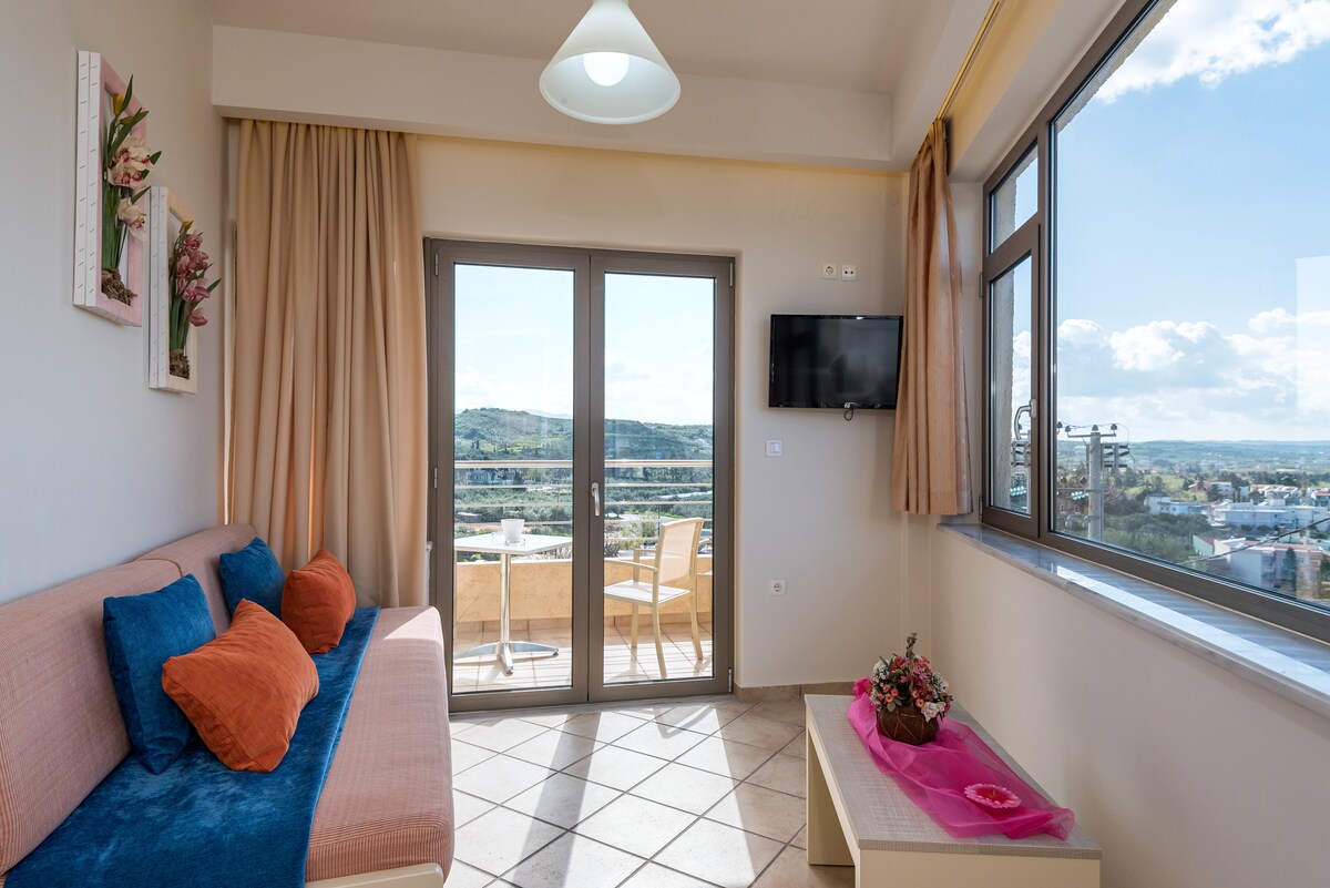 Enjoy your holidays with a breathtaking panoramic view! This house is situated at the top of the hill in the traditional village of Platanias. It features an open space consisting of living room with a sofa bed, fully equipped kitchen, dining table and office desk, a bedroom with a double bed, a bathroom with walk-in shower and two balconies where you can enjoy the amazing sea view.