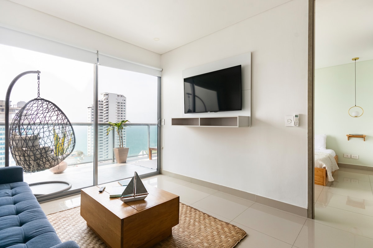 Appartement exclusif au 30e étage de Morros City avec vue incroyable et captivante sur la mer et le centre historique. Chambre principale avec vue directe sur la mer et accès au balcon. Cuisine complète, lave-linge et sèche-linge 2 en 1, télévision connectée 60", WiFi fibre optique 500 Mo. Bocagrande en bord de mer avec équipements de luxe : piscine, jacuzzi, bain turc et salle de sport. Parking gratuit. Idéal pour les couples qui recherchent l'expérience la plus exclusive depuis l'étage le plus élevé disponible dans tout Carthagène