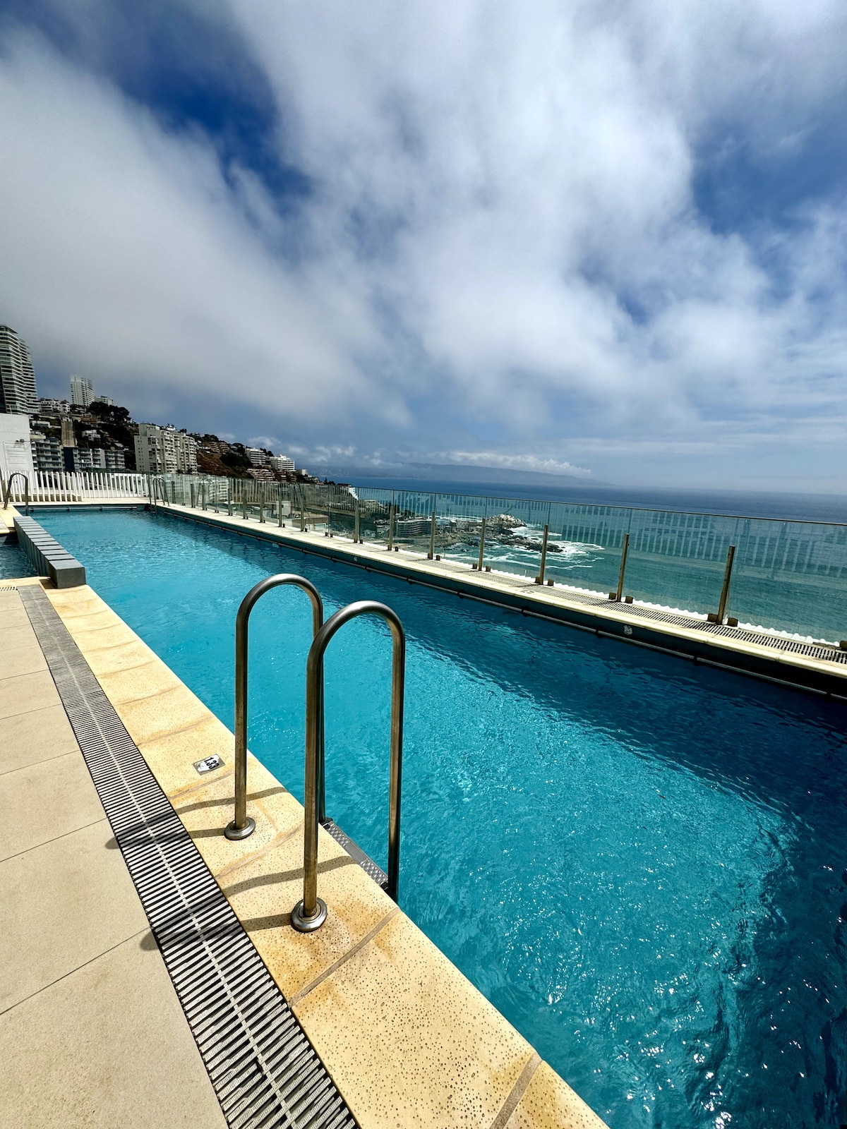 Appartement situé en face de la plage de Cochoa à Reñaca, vue imprenable (première ligne face à la mer), terrasse, parking couvert privé, piscine adultes, piscine enfants, piscine chauffée, salle de sport. 3 chambres (principale en suite avec lit King), 2 salles de bains, Smart TV 4K 55'', TV câble HD, WiFi fibre 600 Mbps, cuisine entièrement équipée, plaque vitrocéramique, lave-linge, tout l'équipement est électrique. Ascenseurs. Funiculaires pour descendre à la plage.