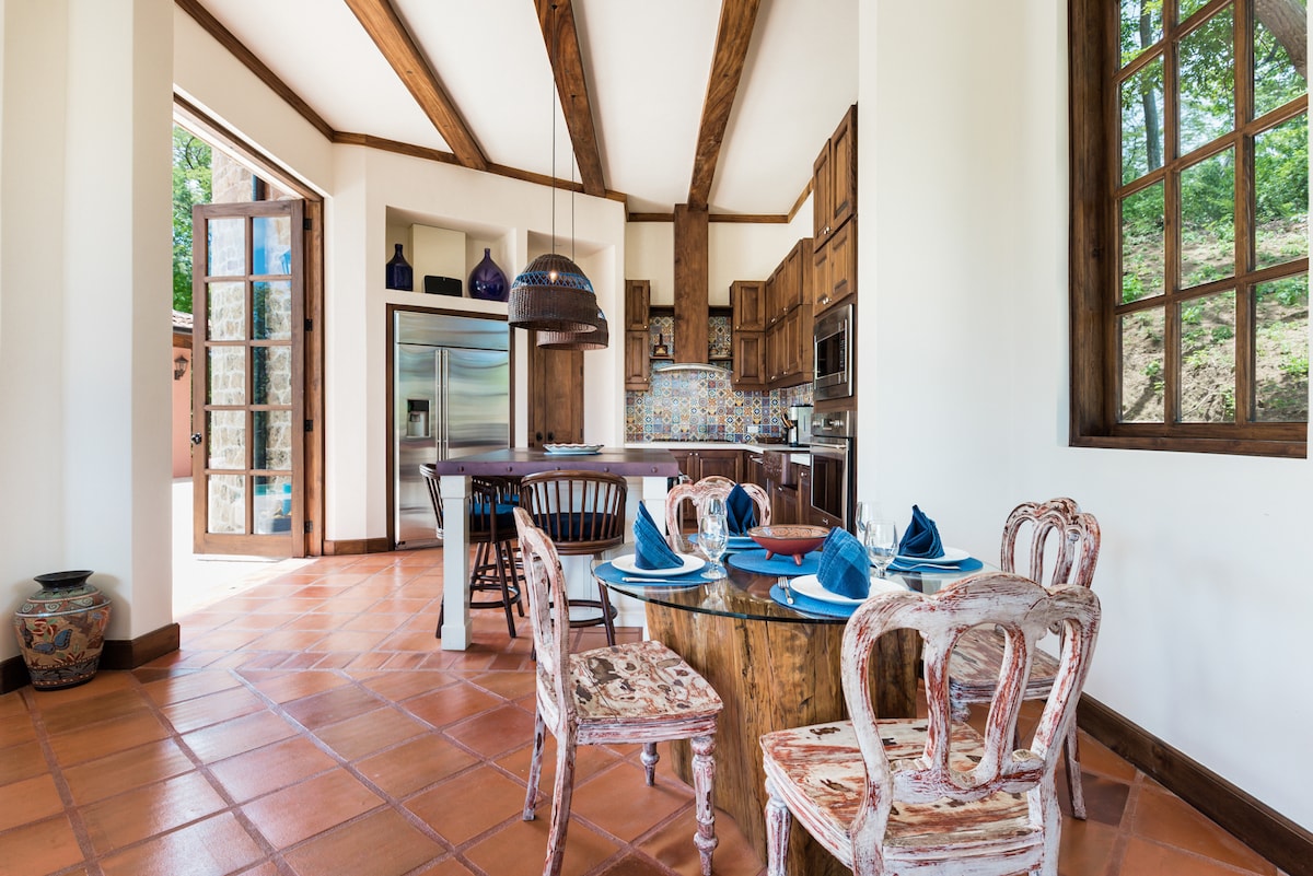 Fishing charters arrive by morning and sunsets glow by evening in the views from this hilltop villa with Mediterranean flair in Ocotal. Columns and wrought-iron decorations frame vistas of lush hillside running down to the ocean, where rocks and islands dot the waves. Venture out to snorkel and sail, take a horseback ride or tour of the jungle canopy, and finish the day 5 minutes away in Coco. Keep an eye out for boats pulling up to the beach below from a terrace with an infinity pool, hot tub, and plenty of seating in the shade. Open the windows in the wellness center and let the breezes flow like a breath through your yoga practice, and heat up the barbecue for an alfresco lunch or dinner. Finish the day with a family movie night in the media room. A slide-away glass wall divides the terrace from an open-concept great room whose wicker and palm-print furniture have a breezy, beachy feel. It’s next to a fully equipped kitchen with a breakfast bar and ocean views. There are 7 bedrooms in the main house and 1 in a separate casita that’s perfect for a couple seeking privacy. Drive 5 minutes or hike 15 minutes to the beach closest to the villa, where you can explore on your own, or if you've paid for the all-inclusive package, relax at a private beach club for which the membership is included. It’s also 5 minutes to the town of Coco, where you’ll find shopping, dining, and a lively nightlife. Copyright © Luxury Retreats. All rights reserved. BEDROOM & BATHROOM Main House • Bedroom 1: King size bed, Ensuite bathroom with stand-alone shower, Walk-in closet, Air conditioning, Ceiling fan, Safe • Bedroom 2: King size bed, Ensuite bathroom with stand-alone shower, Air conditioning, Ceiling fan, Safe, Balcony, View of the ocean • Bedroom 3: King size bed, Ensuite bathroom with stand-alone shower, Air conditioning, Ceiling fan, Safe • Bedroom 4: King size bed, Ensuite bathroom with stand-alone shower, Air conditioning, Ceiling fan, Safe, Shared balcony, View of the ocean • Bedroom 5: Queen size bed, Ensuite bathroom with stand-alone shower, Air conditioning, Ceiling fan, Safe, Shared balcony, View of the ocean • Bedroom 6: 2 Twin size beds, Ensuite bathroom with bathtub and stand-alone shower, Air conditioning, Ceiling fan, Safe • Bedroom 7: 4 Bunk beds, Ensuite bathroom with bathtub and stand-alone rain shower, Walk-in closet, Air conditioning, Ceiling fan, Safe, Shared balcony Private Casita • Bedroom 8: King size bed, Ensuite bathroom with alfresco shower, Air conditioning, Ceiling fan, Safe Additional bedding • Wellness Center: Murphy bed FEATURES & AMENITIES • Wellness center • Ocean views • More under “What this place offers” below Included • Personal concierge • All beverages – house alcohol open bar for adults, coffee espresso bar and all non-alcoholic drinks • More under “What this place offers” below At Extra Cost • Laundry service • Activities and excursions • More under “Add-on services” below