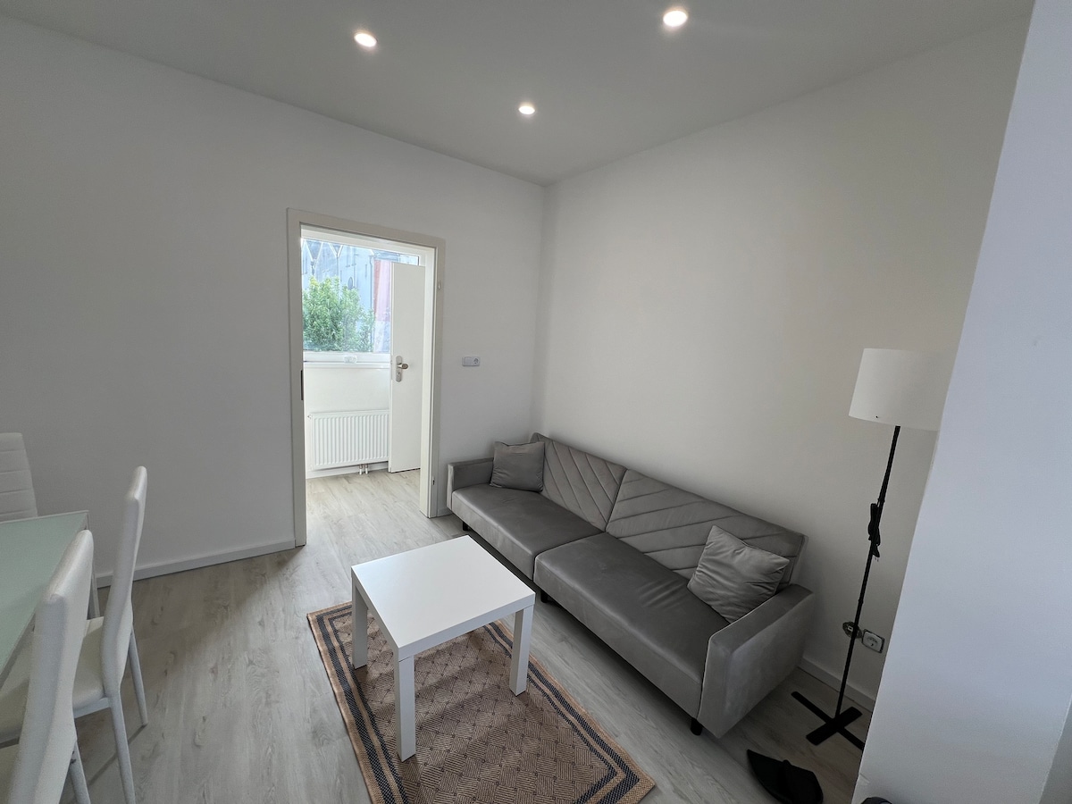 Appartement entièrement rénové et meublé de 22m2/ 1 pièce. Il y a un accès privé, à l'appartement en sous-sol. La hauteur du plafond est d'env. 195 cm. En plus, il y a une petite cuisine, avec une plaque vitrocéramique, un évier et un réfrigérateur/congélateur. La cuisine est entièrement équipée. Des toilettes séparées avec lavabo et sèche-cheveux font également partie de l'appartement, ainsi qu'une douche. Une télévision, des commodes, une table à manger avec 2 chaises. Un grand lit boxspring fait également partie de l'équipement. Nous vous souhaitons de bonnes vacances
