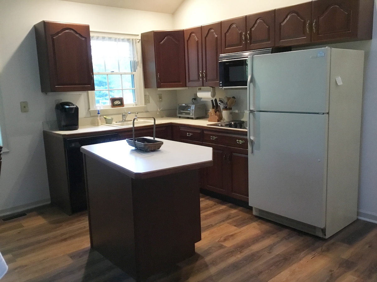 Notre maison d'hôtes de 1200 pieds carrés avec 2 chambres est calme, propre, confortable et privée. Laissez la lumière briller en profitant de la vue sur le vaste jardin et la prairie entourant la propriété ! Les fenêtres du plafond de la cathédrale ainsi que la baie vitrée éclairent cette suite ouverte composée des espaces salon, salle à manger et cuisine. Cette maison d'hôtes peut accueillir quatre personnes. Si plus d'espace est nécessaire, visitez notre autre annonce Calme, Tranquille et Isolé sur airbnb.com/h/blueroom360mnm.