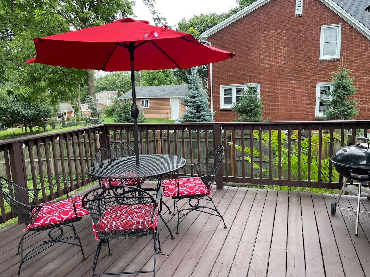 This is a private guest suite (FULL lower level walkout - approx 1,750 sq ft) within our larger 3-story occupied home. A comfortable home-away with 2 bedrooms, 1 full bath, living room, and kitchen with full-frig, dishwasher, coffee maker, electric range, toaster oven, microwave and counter that seats 6. New mattresses, bedding, pillows, and towels. Guests welcome to use back patio area with natural fire pit, covered pavilion with gas fire feature, grill and hot tub. Great Wifi and Smart TV.