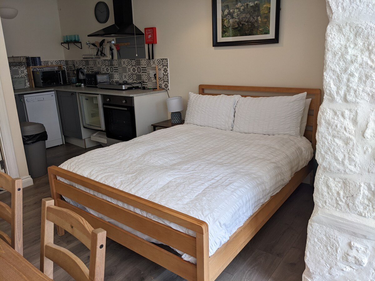 Le Lodge est une propriété récemment rénovée. Il est complètement indépendant avec son propre patio. L'espace de vie est ouvert avec une grande cuisine, une table et des chaises, deux canapés et une télévision par satellite. La chambre du bas peut être aménagée avec un lit King Size ou deux lits simples selon les besoins. Cette chambre dispose d'une salle d'eau attenante. À l'étage, il y a une chambre king size avec une fenêtre Velux et une salle de bains luxueuse avec une belle fenêtre ronde. Le Lodge se trouve à 5 minutes en voiture de la plage.