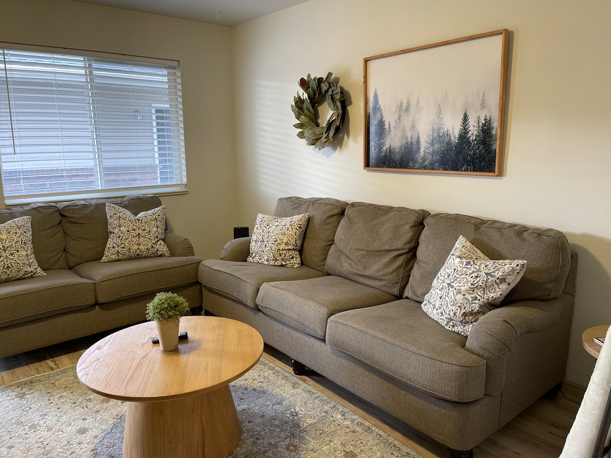 Bienvenue dans notre espace ! Cet appartement a été conçu spécialement pour les voyageurs. Tout dans la maison est neuf et d'une propreté irréprochable. Il est équipé de tout ce dont vous avez besoin pour vous détendre et vous amuser. Un lave-linge et un sèche-linge sont disponibles. Les accents en bois proviennent d'une ferme à Bancroft, ID. Ma femme et moi espérons que vous apprécierez cet espace autant que nous avons aimé le concevoir !