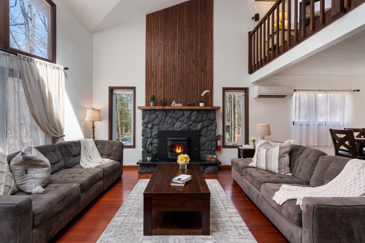Évadez-vous dans une escapade d'automne confortable près de Kalahari, du casino Mount Airy, des magasins d'usine Crossings, du lac Wallenpaupack et du parc d'État de Tobyhanna à 2 miles avec des feuillages d'automne, de l'air de montagne, des vues sur le lac, de la faune et des lieux de pique-nique. Niché sur une route privée accidentée. Cette retraite de style spa dispose d'une baignoire, d'une douche à effet pluie, de lumières intelligentes, d'une cuisine avec cuisinière intelligente, de lits moelleux, de miroirs LED avec synchronisation musicale et d'un divertissement d'arcade rétro. Parfait pour les couples, les escapades d'anniversaire ou les familles à la recherche d'un séjour paisible à Poconos avec des équipements modernes.