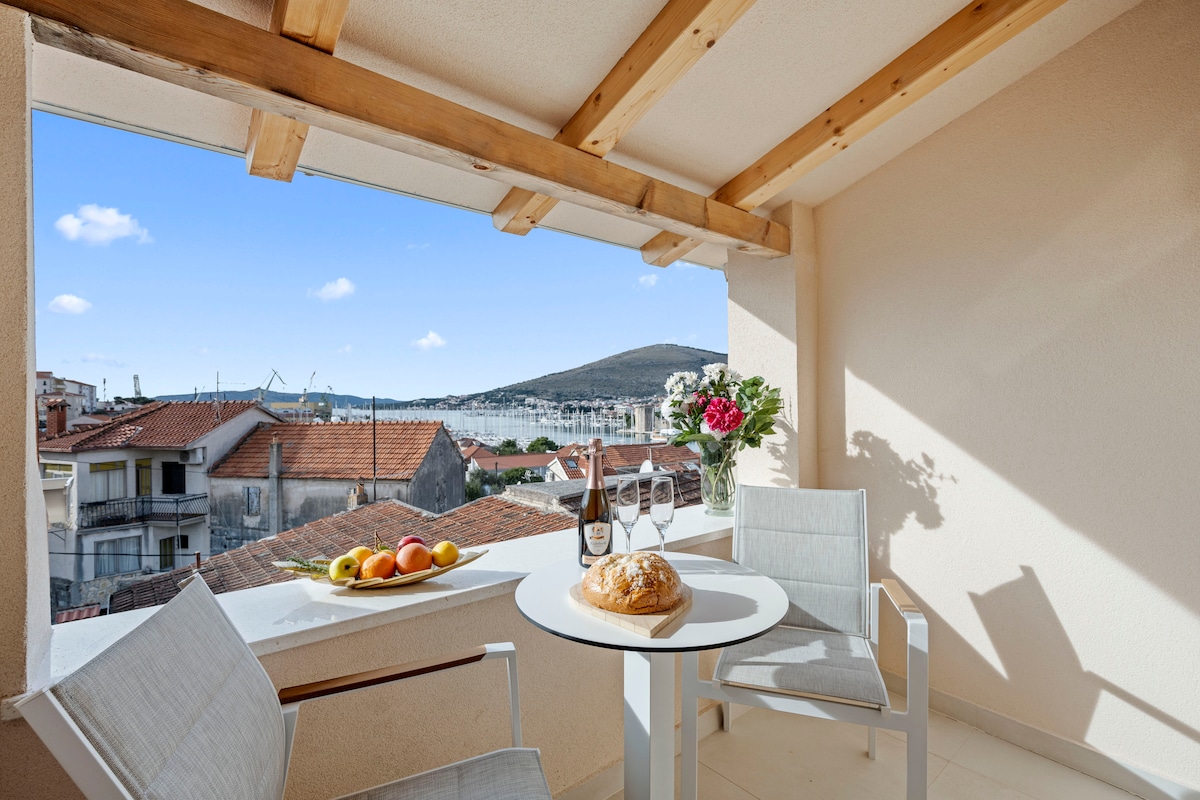 Cozy studio with a stunning sea view with shared terrace. Located by the beach, just 2 km from Trogir, this small but fully equipped studio is a great base for your vacation in central Dalmatia. A beautiful pebble beach is right across the street — just a few steps away. The terrace is shared between two studios, with a designated area in front of each for private use. Please note that during peak season, street parking can be difficult to find, even further from the house.