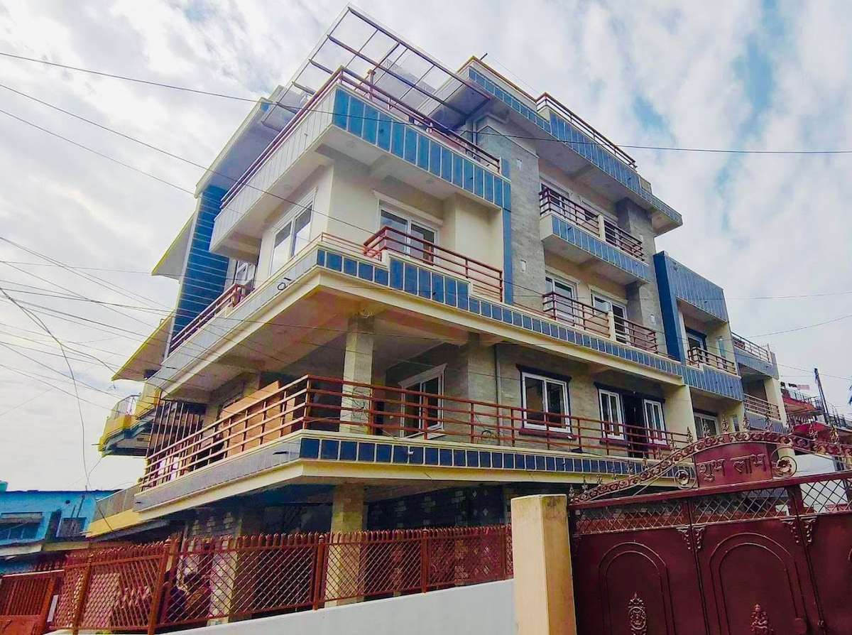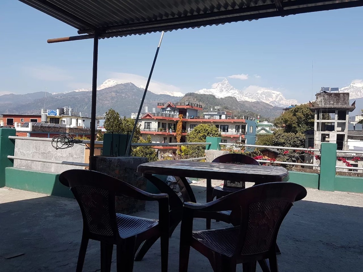 "Notre appartement meublé est une "maison loin de maison",situé au bout d'une ruelle étroite de nouveau côté colline donnant sur la belle Fewalake avec de beaux jardins de serre botanique. C'est étonnamment pratique - seulement 10 minutes à pied du bord du lac de Pohkara qui offrent une cuisine raffinée en privé avec des vêtements & épicerie.Les chambres sont spacieuses, lit confortable avec cuisine complète. L'endroit est idéal pour une vue spectaculaire sur le lever du soleil depuis le balcon, à 30 sec à pied de la route principale, une salle de sport à courte distance, une bonne vue avec foyer depuis la terrasse.