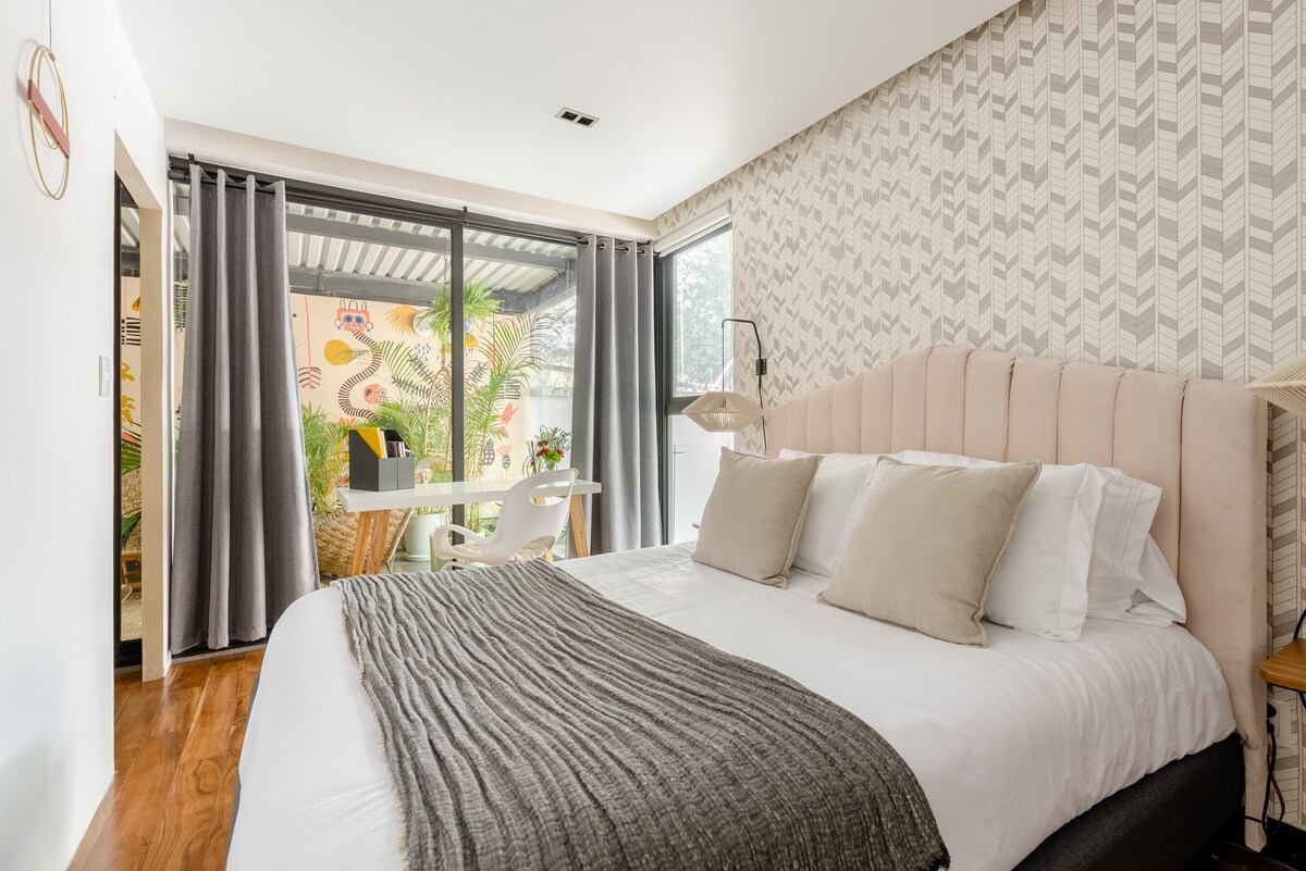 Bienvenue à L'ENDROIT de vos vacances avec un appartement design unique à Mexico. Des plantes vivantes partout, des planchers et une décoration en bois, des textures et des motifs contrastés, un mur peint par un artiste sur la terrasse principale et des espaces de vie ouverts et fluides. Une terrasse ouverte sera l'endroit idéal pour se détendre après une longue journée au Mexique. L'endroit est plein de détails et d'équipements pour vous. Nous supervisons chaque propriété après notre service de nettoyage, c'est une étape très importante pour nos voyageurs.