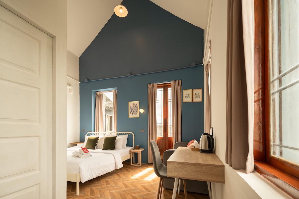 La chambre n ° 301 fait 65 m ², le Mustang Blu est une auberge de jeunesse magnifique située dans le vieux quartier de Bangkok; réputée pour ses bâtiments de style colonial. Situé dans le majestueux Triangle sur Maitri Chit Road. Accès facile à la station de métro Hua Lamphong MRT et à la gare. Nos chambres sont conçues pour correspondre à l'architecture vintage d'origine, meublées avec des meubles anciens et des matières premières pour créer une atmosphère extraordinaire garantie pour vous offrir une expérience inoubliable.