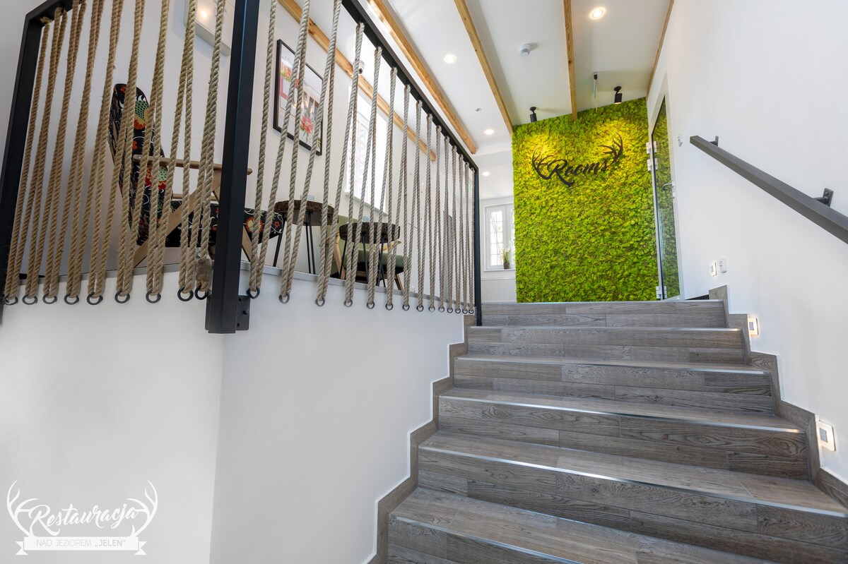 Notre établissement dispose de neuf chambres. Ils sont nouveaux, créés en mai 2018. Une chambre est avec salle de bains, pour le reste des chambres, salles de bains sont situées dans le couloir. Le restaurant " Lake Jeleń" est ouvert aux clients pendant la période des vacances, cependant, à la demande des clients de l'hôtel, il est possible de préparer le petit déjeuner. Cet établissement est également célèbre pour l'organisation de toutes sortes d'événements occasionnels, c'est pourquoi nous réservons généralement une salle le week-end.