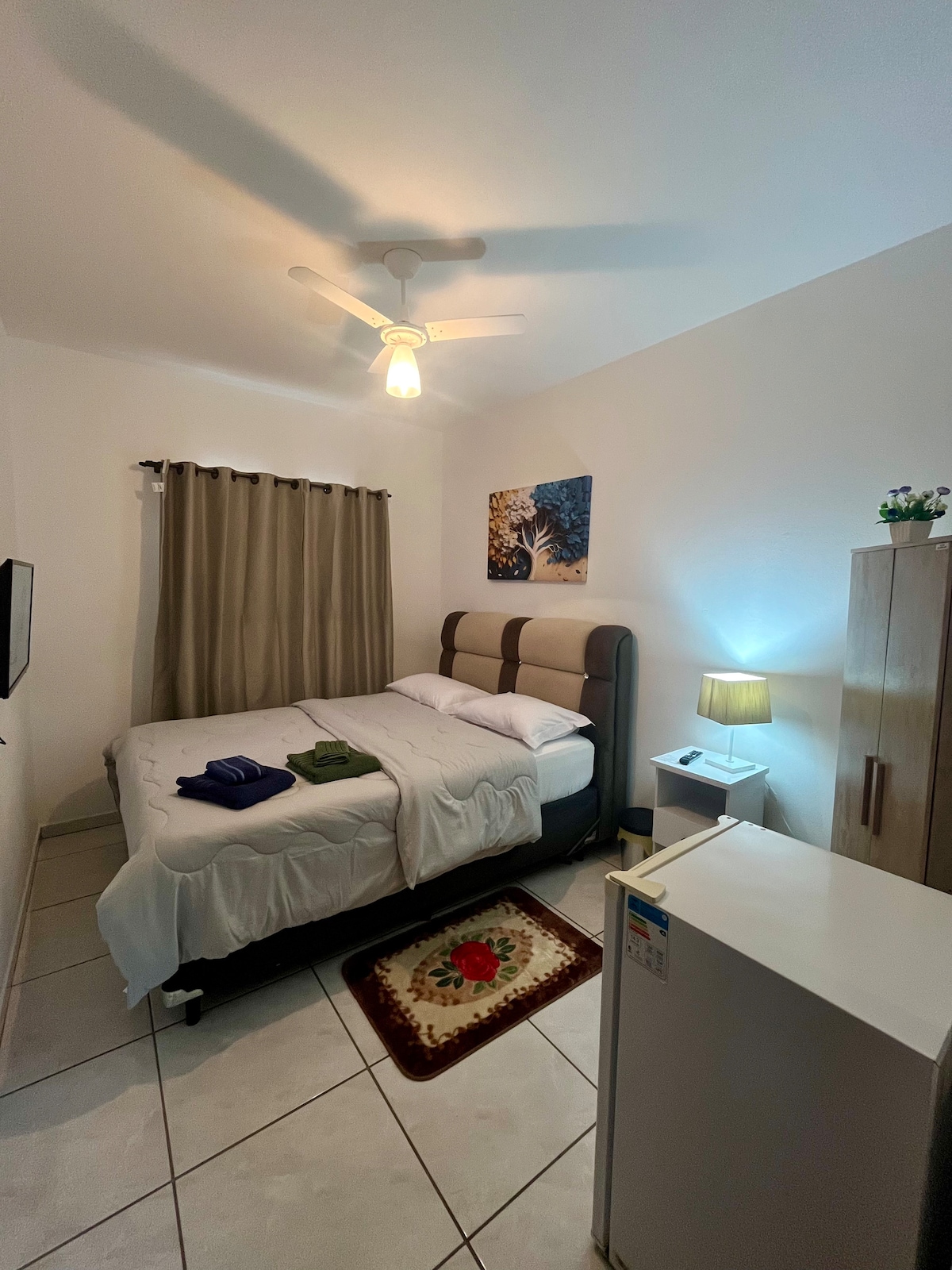 Este studio é um conceito moderno para quem gosta de ter um espaço integrado e prático para o dia a dia, é a hospedagem ideal para quem procura um espaço para descansar e relaxar, ou ainda fazer home office. Fica aos fundos de nossa casa com total privacidade e conforto. Além disso, disponibilizamos toalhas de banho, roupa de cama e cobertores. Possui cama de casal e uma de solteiro auxiliar. Banheiro amplo e privativo.
