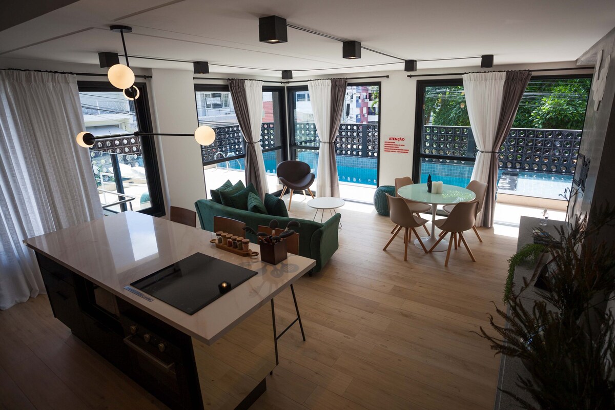 Looking for a cozy checkpoint in the heart of the city? You'll feel at home in this well-planned loft. Located in downtown Florianopolis, it's perfect for someone looking to explore the island or attend to an event nearby. Includes: - Queen bed - Complete gourmet kitchen - Washer and drier - Big table for meals and Home Office - 360 Rotational TV so you can watch from anywhere in the loft - Clean and modern bathroom - Wi-fi - Complete air conditioning