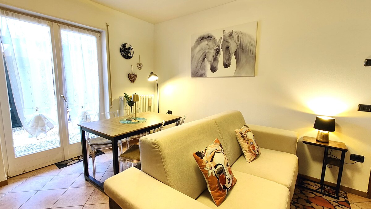 L'appartamento moderno e accogliente con parcheggio privato recintato gratuito, garage per bici e attrezzatura e ampio giardino con bbq e gazebo. Situato al 2° piano con ingresso autonomo, camera con 3 posti letto, open-space con cucina e soggiorno con divano letto matrimoniale, bagno finestrato con doccia walk-in e ampio balcone vista montagne. Attrezzato di lavastoviglie, lavatrice, macchina Nespresso, Wi-Fi e Smart TV. Ospita fino a 5 persone.