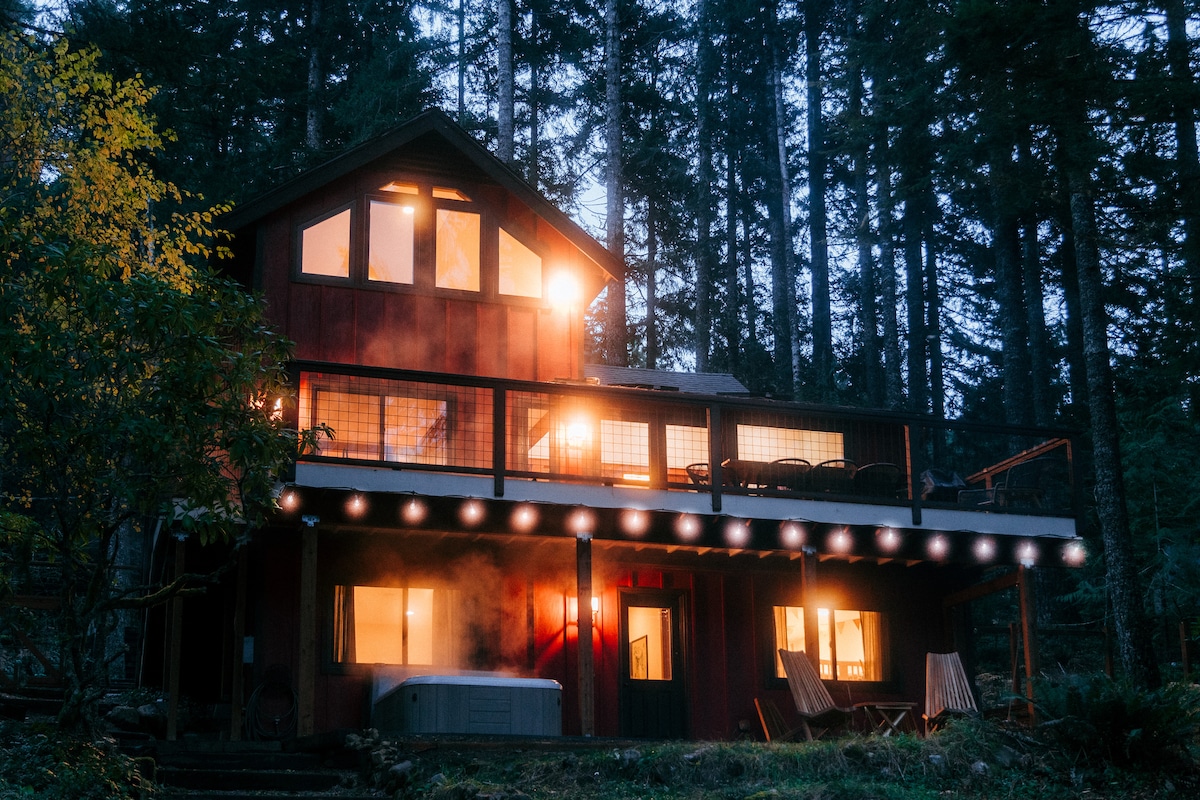 Fir Haven, située à 15 minutes de la ville, se trouve sur un domaine privé de 16 hectares qui appartient à la famille depuis des générations. Le cottage de 56 m² donne sur un grand champ entouré de forêt, de vergers, de sentiers, de canyons et de Siebert Creek. Il est idéal pour les couples et les amis proches, avec 2 chambres dédiées et un salon confortable. **12 ans et plus uniquement pour des raisons de sécurité !** Explorez la propriété, découvrez l’étang et parcourez les sentiers qui serpentent autour du champ de 6 hectares et à travers des hectares de la magnifique forêt du nord-ouest du Pacifique.