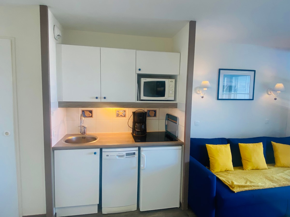 Idéalement situé dans une jolie résidence sécurisée, je saurai faire de votre séjour un moment de détente agréable. En plein cœur du port du Crouesty offrant de nombreux restaurants et boutiques, à deux pas de la plage du Fogeo et de la Thalasso du Miramar, je suis un élégant studio de 24m2 pouvant accueillir 4 personnes. Refait à neuf en avril 2023, j'offre de belles prestations et une vue imprenable. Mon charme saura à coup sûr vous séduire... Ménage et linge de lit et de bain non compris. 😉
