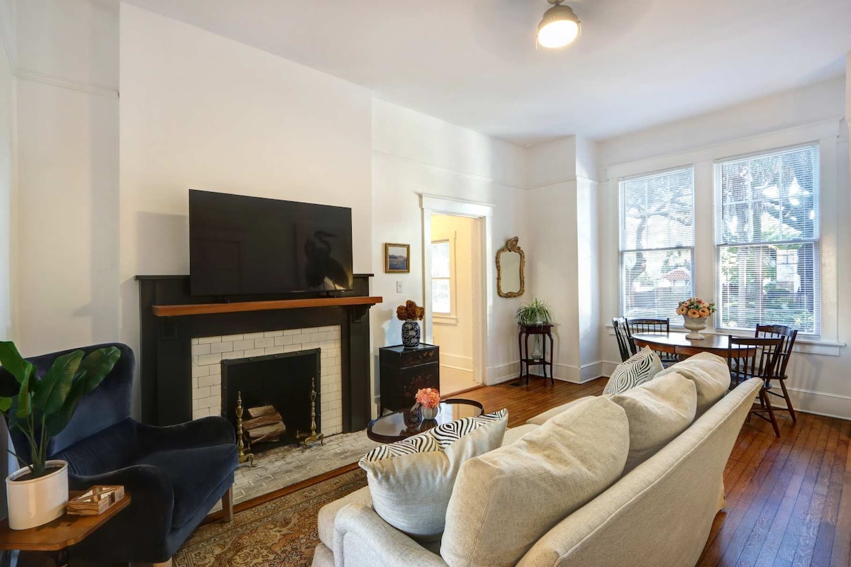 Séjournez directement sur Forsyth Park — pas « près », mais vraiment à quelques pas. Sortez par la porte, traversez la rue et vous êtes instantanément dans le jardin parfumé, avec l'emblématique fontaine Forsyth à seulement un pâté de maisons. Datant de 1898 environ, ce studio victorien romantique dispose de plafonds de 12 pieds, de beaux planchers en pin et d'un lit à baldaquin king size (Tuft & Needle) conçu pour des soirées de rêve à Savannah. Profitez de rideaux occultants, d'une salle de bain complète avec baignoire/douche, d'une cuisine complète confortable et d'un petit futon pour un troisième voyageur.
