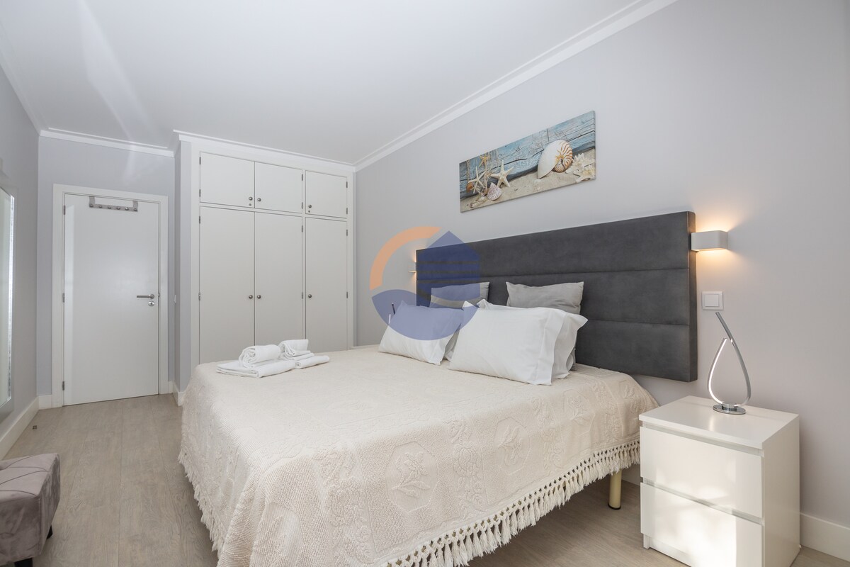 Retraite spacieuse et élégante en bord de mer à Portimao ! Cet appartement est parfait pour les couples, les familles ou les amis. Emplacement idéal : à seulement 5 minutes à pied de la plage dos Três Castelos ou 11 minutes de Praia da Rocha. Parking privé couvert gratuit. Chambre confortable avec lit king size. Deux piscines extérieures. Salle de sport au premier étage (en supplément) Cuisine équipée : cuisinez vos repas préférés, avec un ensemble complet d'appareils modernes. Terrasse avec vue sur la montagne et couchers de soleil.
