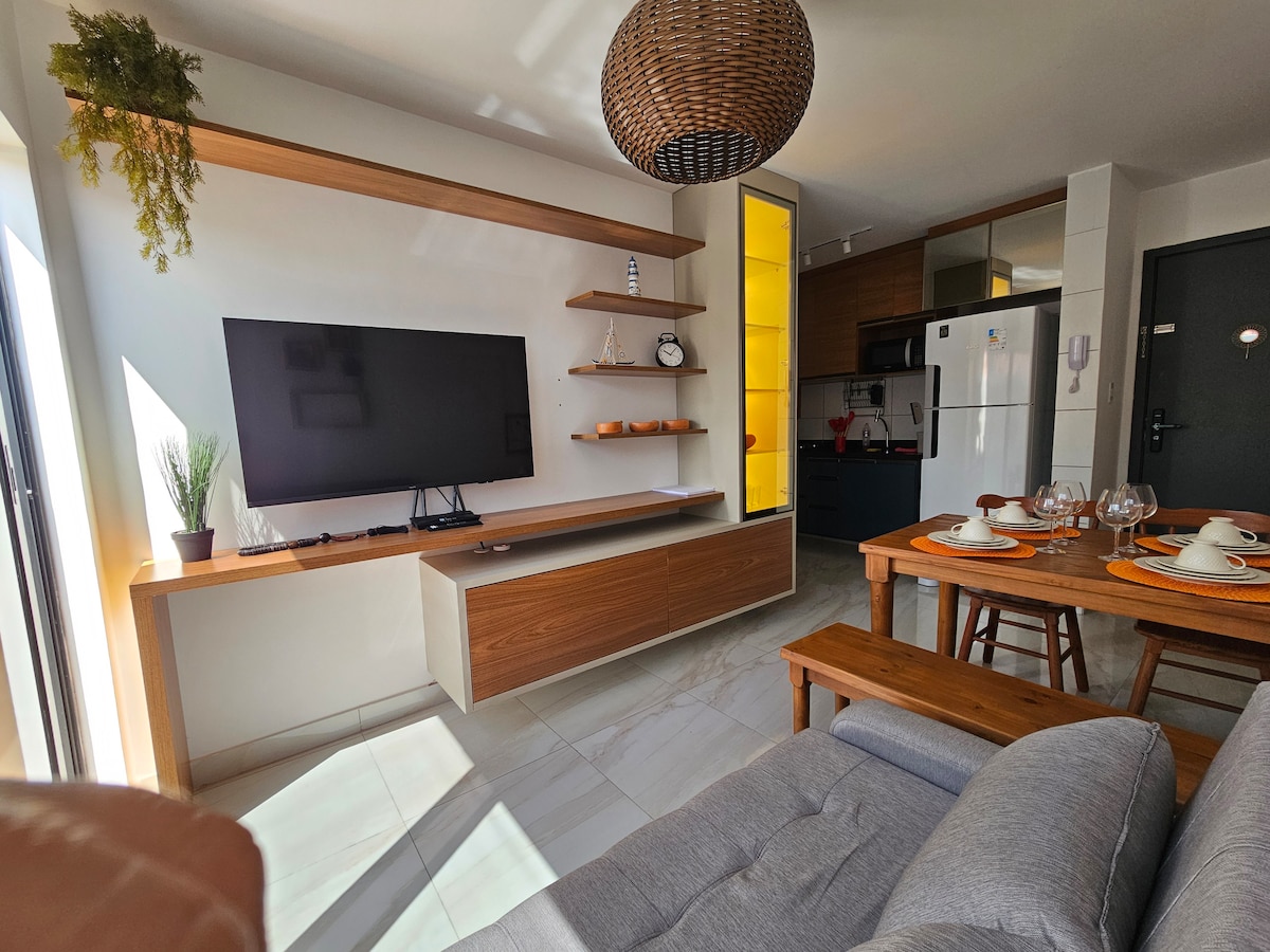 Appartement meublé de 25 m² à Praia do Bessa, à 700 m de Caribessa. Vue sur la mer du Sud, balcon avec hamac, lit double et canapé-lit pour 4 personnes maximum. Piscine à débordement, toit-terrasse, salle de sport, espace gastronomique, bar snooker, buanderie collective et 1 espace rotatif. Cuisine équipée, Wifi, TV, climatisation. Emplacement stratégique, idéal pour vivre ou louer. Le conseil municipal n'accepte pas les animaux domestiques et les visiteurs. Nous n'offrons pas de petit-déjeuner. Des règles claires garantissent confort et tranquillité.