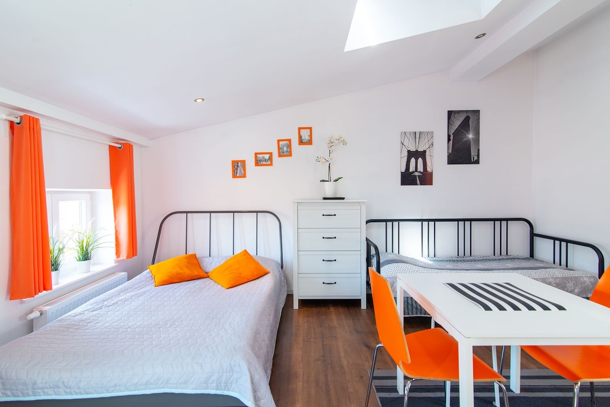 Komfortowy apartament w centrum miasta, położony zaledwie 100 m od Starego Rynku. Idealna lokalizacja zapewnia szybki dostęp do restauracji, kawiarni i najważniejszych atrakcji. Apartament oferuje bezpłatne Wi-Fi, prywatny parking (wymagana rezerwacja) oraz ekspresowe zameldowanie i wymeldowanie. Do dyspozycji gości jest także przechowalnia bagażu. Dostępne są pokoje rodzinne, a w wybranych apartamentach klimatyzacja. Małe zwierzęta akceptowane na zapytanie. Idealny nocleg w samym sercu miasta.