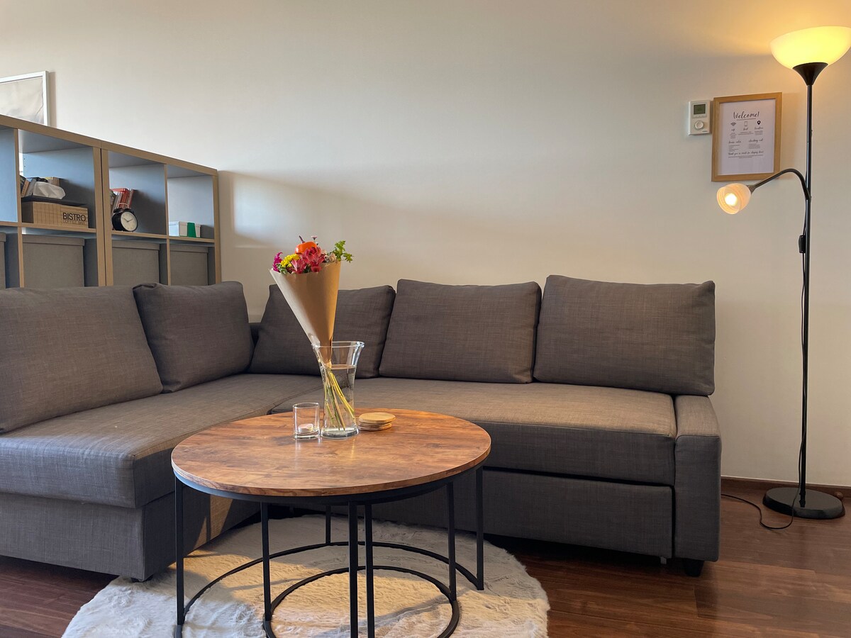 If you are traveling by yourself then this apartment is just what you’re looking for. It is a compact, yet comfy, bright one-bedroom apartment with wooden furniture and a French window. The apartment has a storage unit, a big TV on the wall, and a fully equipped kitchen. (The kitchen is shared with 3 other apartments). The design of the bathroom is minimalistic but underlined with warm colors and large tiles. You can also spend time on the balcony which is a part of the shared spaces.