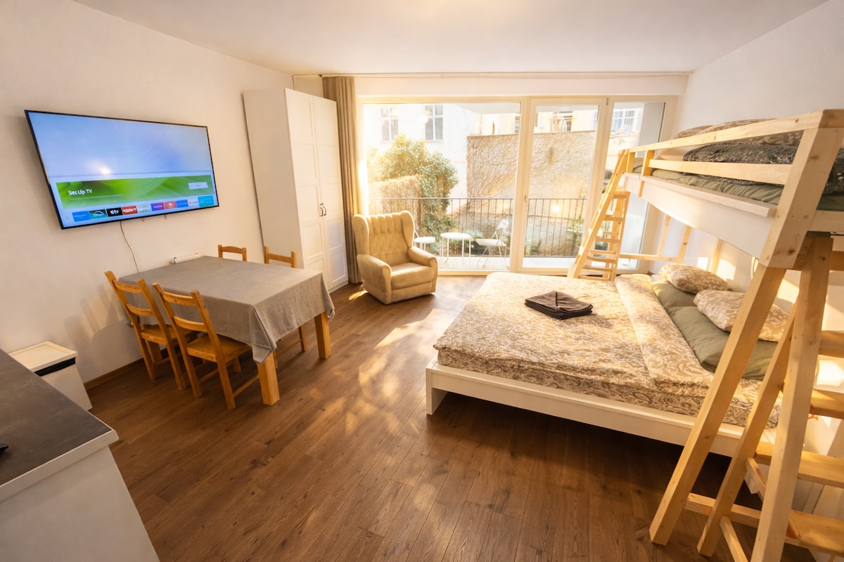 Découvrez cet appartement récemment rénové, qui offre un espace de vie idéal avec tout le confort nécessaire. La chambre, inondée de lumière naturelle, est équipée d'un lit king-size confortable pour des nuits paisibles. La chambre donne sur un balcon avec vue sur un châtaignier et un bambou majestueux et la colline de Vitkov avec la statue de Jan Zizka et un monument national. La cuisine est moderne et entièrement équipée, parfaite pour préparer vos repas. La salle de bain dispose d'une grande douche à l'italienne.