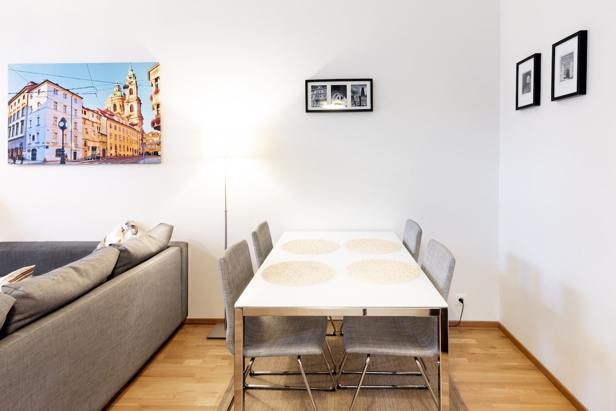 Emplacement imbattable en centre-ville : vivez au cœur de Prague Sortez de votre porte et soyez à seulement 1 minute de l'emblématique pont Charles et à quelques pas du château de Prague, de la vieille ville, du parc Kampa et de la tour Petřín. Découvrez la ville comme un habitant. Appartement de luxe au 5e étage pour 3 personnes • 3 chambres spacieuses • Buanderie • Salle de bain + toilettes séparées • Balcon privé + balcon partagé • Vue imprenable sur le dôme Saint-Nicolas et le château de Prague • Immeuble moderne avec ascenseur