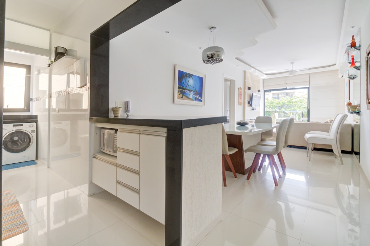 Bel appartement, neuf, propre et bien ventilé. La copropriété dispose d'un service de plage et d'un espace de loisirs complet. Il y a 3 chambres et 2 salles de bains, dont une suite avec un lit queen size et les 2 autres chambres avec des lits jumeaux identiques, qui peuvent être réunis. Il dispose de 2 places de parking, de la climatisation dans toutes les chambres et dans le salon. L'emplacement est parfait. Il est à 2 pâtés de maisons de la plage d'Enseada, entouré de restaurants, pharmacies, supermarché, magasins. Vous pouvez tout faire à pied.