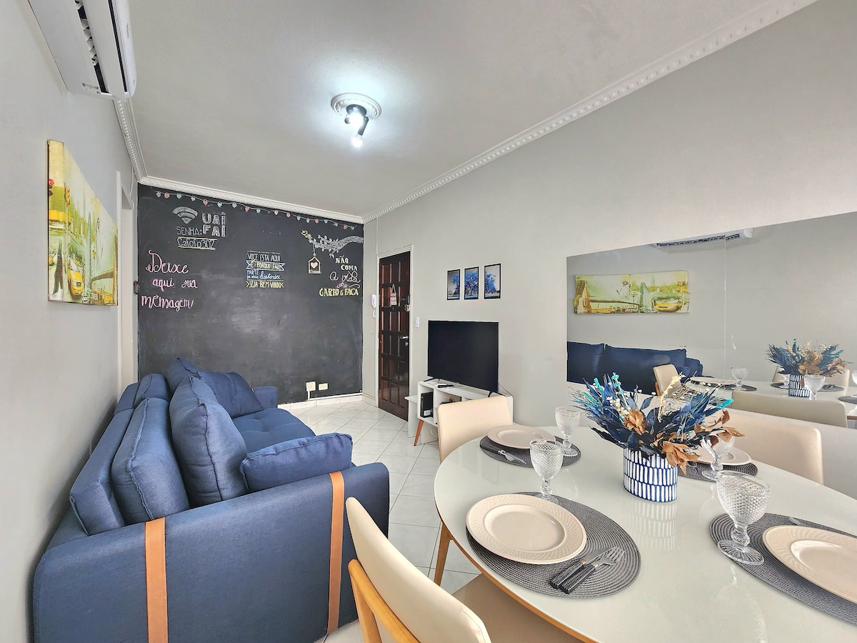 Détendez-vous avec toute la famille dans ce logement paisible. Nous avons un espace confortable pour le repos et les loisirs. Chambres climatisées, chambre double avec TV 65", salon avec ventilateur de plafond, TV 55" avec Netflix et Wi-Fi, cuisine entièrement équipée avec appareils électroménagers. À seulement 50 mètres de la plage, à côté de la pizzeria la plus réputée de Praia Grande, d'un restaurant et d'une boulangerie, c'est un excellent emplacement. Le bâtiment dispose également d'une salle de jeux et d'une piscine et d'un espace pour se réunir.
