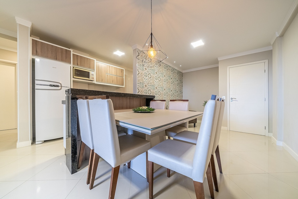 Bel appartement avec 02 chambres - Praia de Bombas - à 300 mètres de la plage. Finement décorées, lits box, climatisation dans tous les dortoirs et dans le salon, cuisine complète avec tous les ustensiles, laveuse et sécheuse, balcon avec barbecue, salon avec SMART TV et système de chaînes satellite et wi-fi. Nous offrons de la literie, des serviettes de bain, des chaises longues et un parasol.