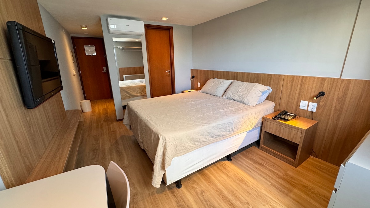 Dans le meilleur emplacement de Natal. Situé sur l'avenue Engenheiro Roberto Freire, à l'étage et avec vue sur la mer. Au cœur du tourisme de Natal. Près de la plage, des centres commerciaux, des pharmacies et des supermarchés. Le bâtiment dispose d'un parking, d'une piscine, d'un restaurant, d'une salle de sport et d'un auditorium pour les événements. La chambre est à l'étage avec un lit double, un réfrigérateur et un micro-ondes, la climatisation, une télévision et une douche chaude.