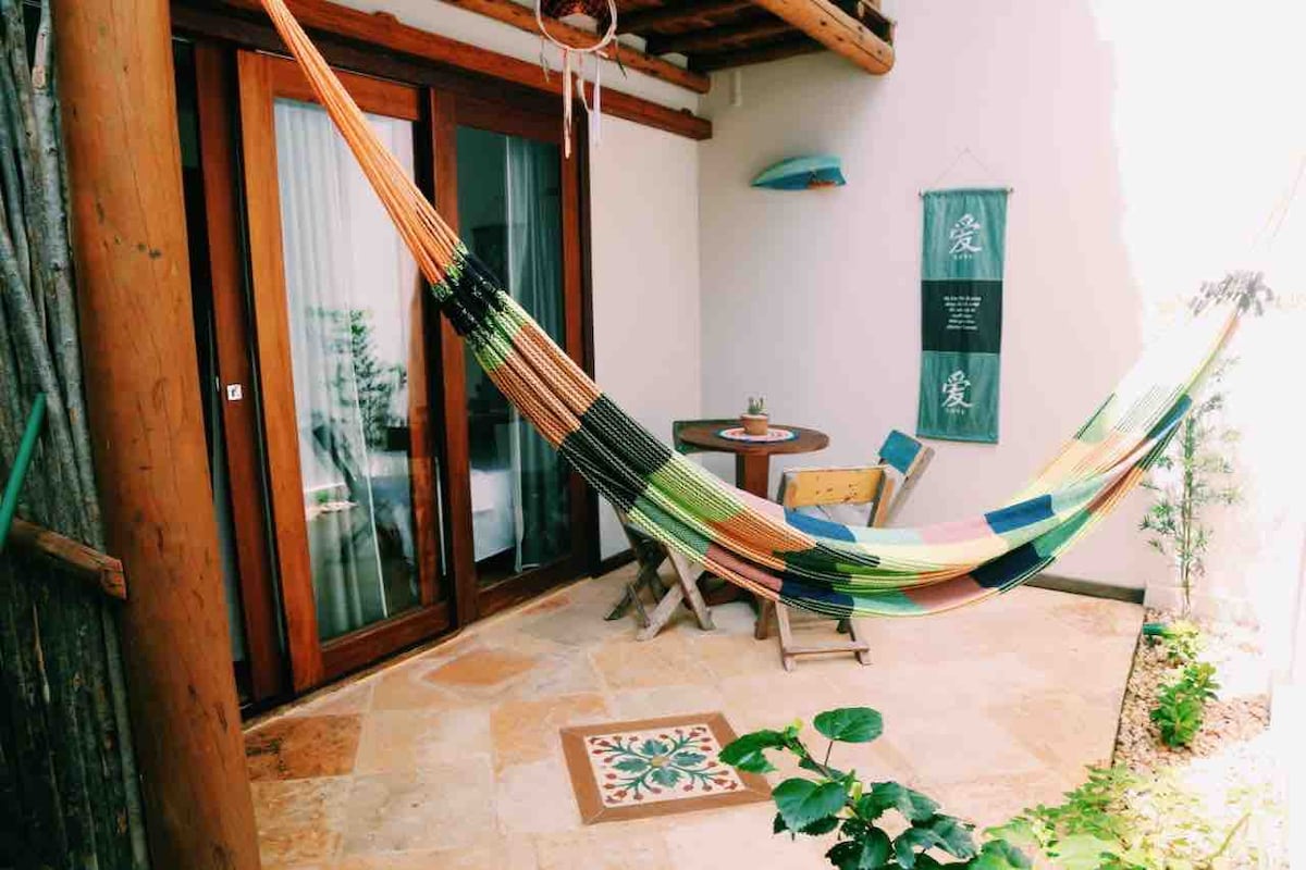 Chalet de charme, rustique et équipé. Pour ceux qui recherchent un endroit calme proche de tout. Il dispose d'une cuisine entièrement équipée avec un purificateur d'eau. Une chambre avec un lit double, une table de chevet, la climatisation, un porte-vêtements et une télévision connectée de 32 pouces. Salon avec canapé-lit simple, ventilateur portable, armoire, tiroirs et miroir. Salle de bain privée avec eau chaude. Zone de service. Excellente connexion Wi-Fi pour le travail à distance. Le jardin est magnifique avec une grande douche pour se rafraîchir. Une excellente option à Jeri !
